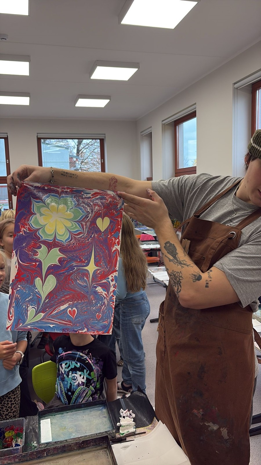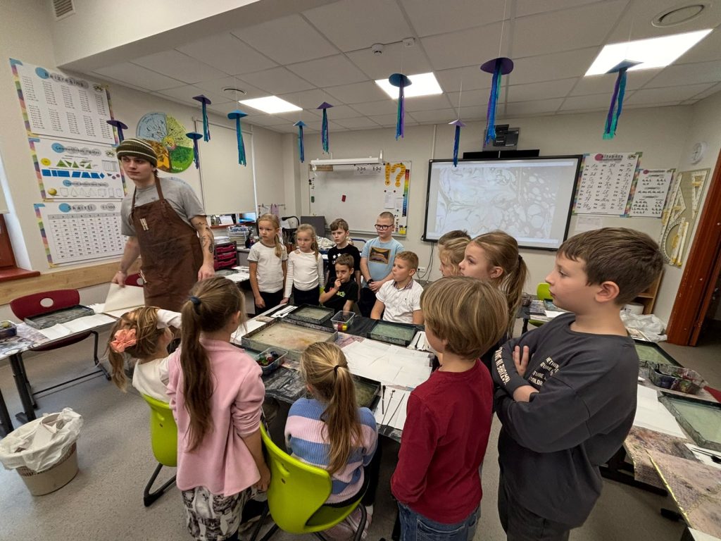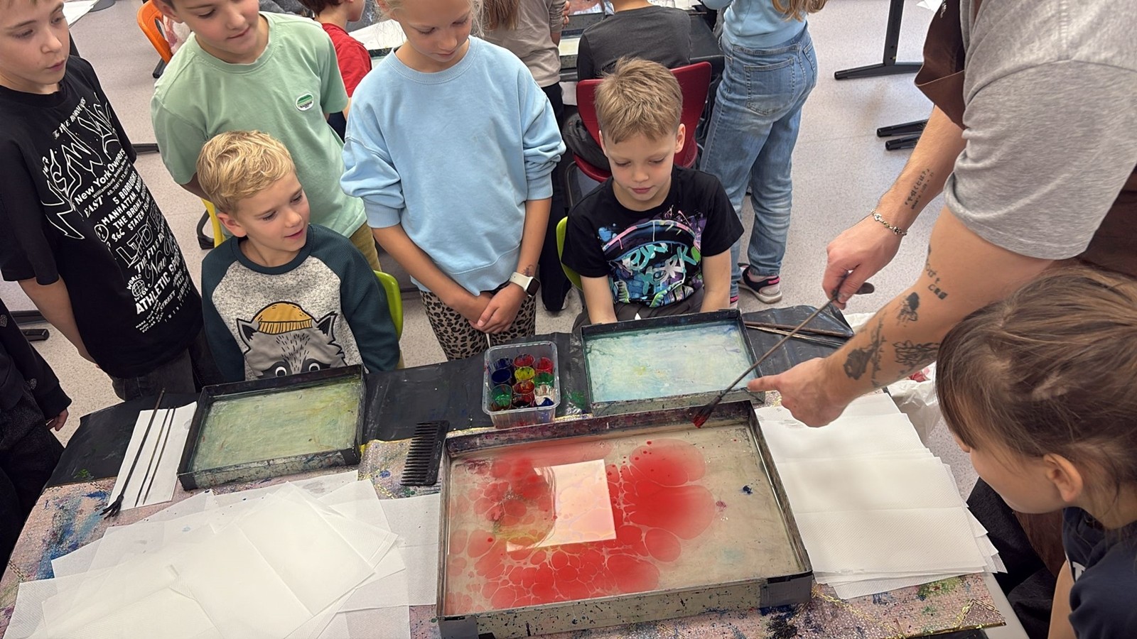 5. novembrī 2. klasēm saistībā ar “Latvijas skolas soma” bija iespēja izmēģināt roku apburošajā EBRU mākslā – gleznošanā uz ūdens. Šī fantastiski senā tehnika, kas iekļauta UNESCO mantojumu sarakstā, pārsteidza gan bērnus, gan skolotājus ar savu maģisko procesu – krāsa izplešas uz ūdens un pārtop neatkārtojamā mākslas darbā.