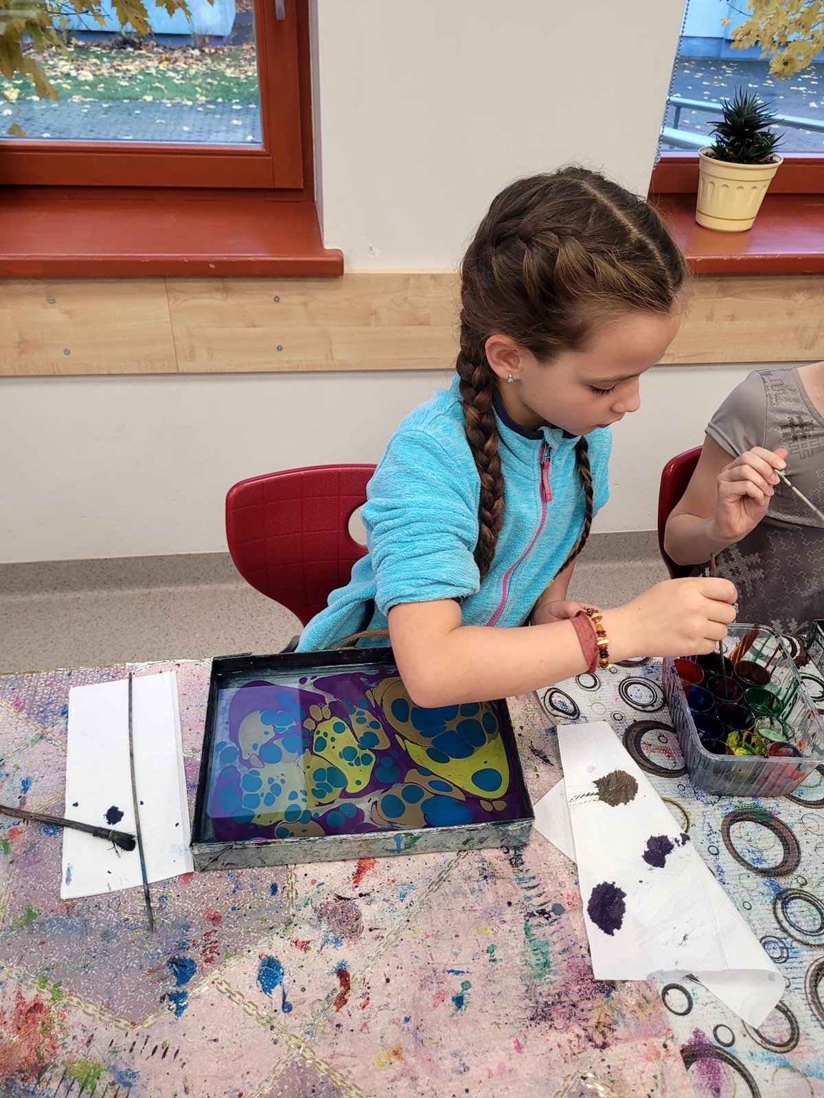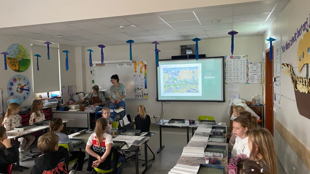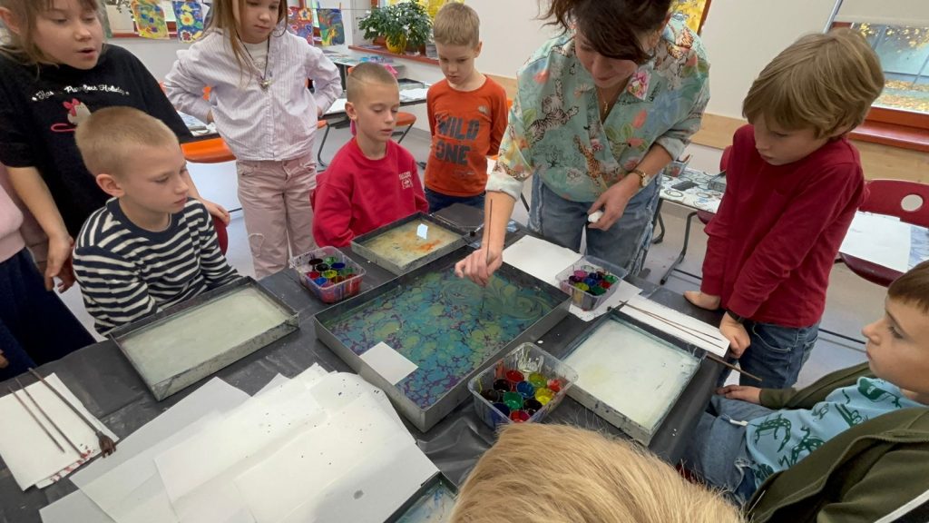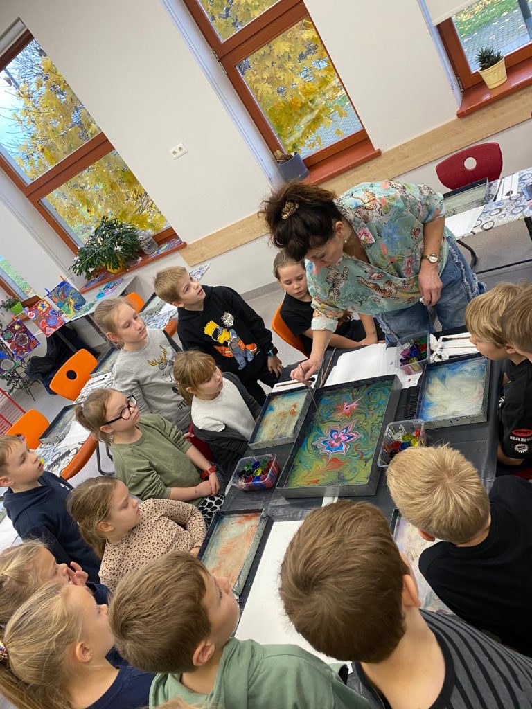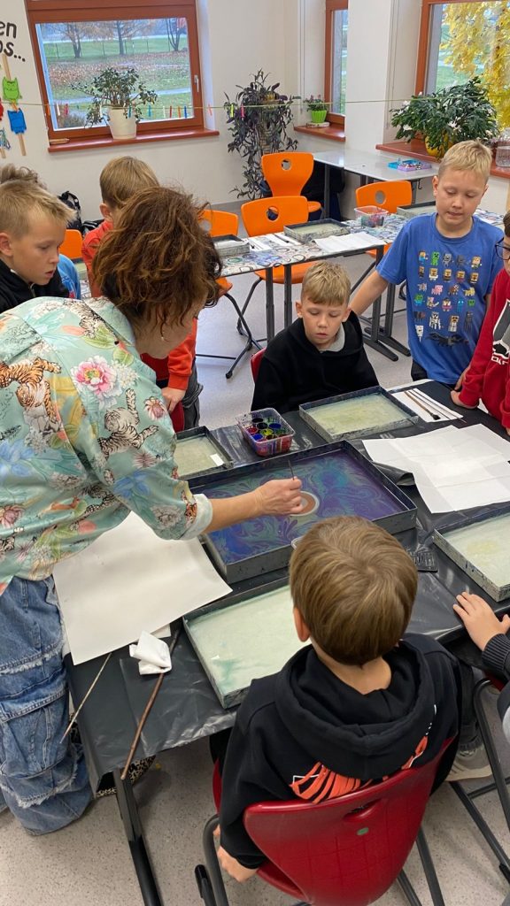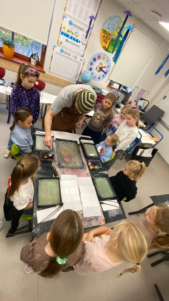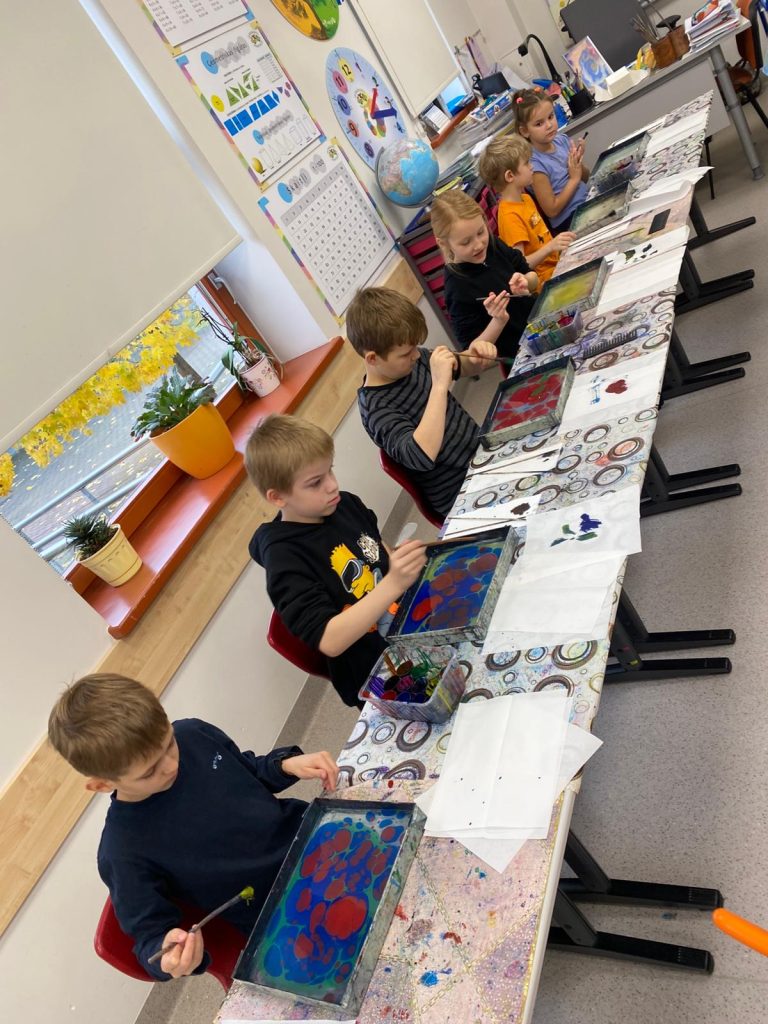 Tā skolēnam bija, kā rotaļa un meditācija, kur katrs skolēns veidoja savu mākslas darbu ūdenī, tad to pārcēla uz papīra, izveidojot unikālu glezniņu.