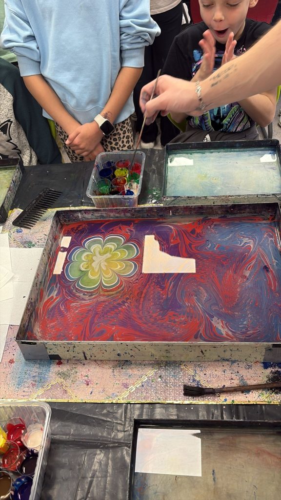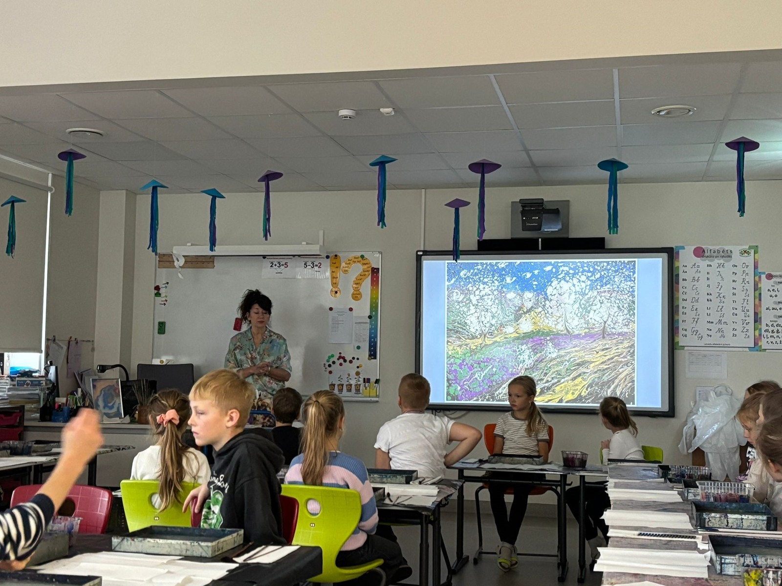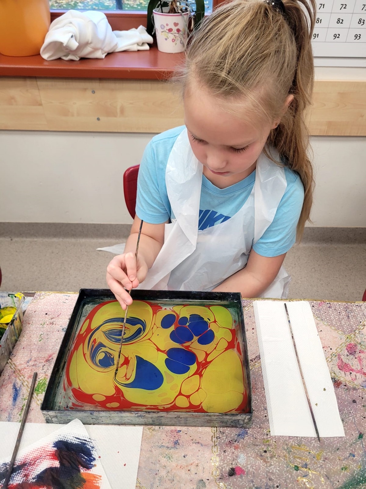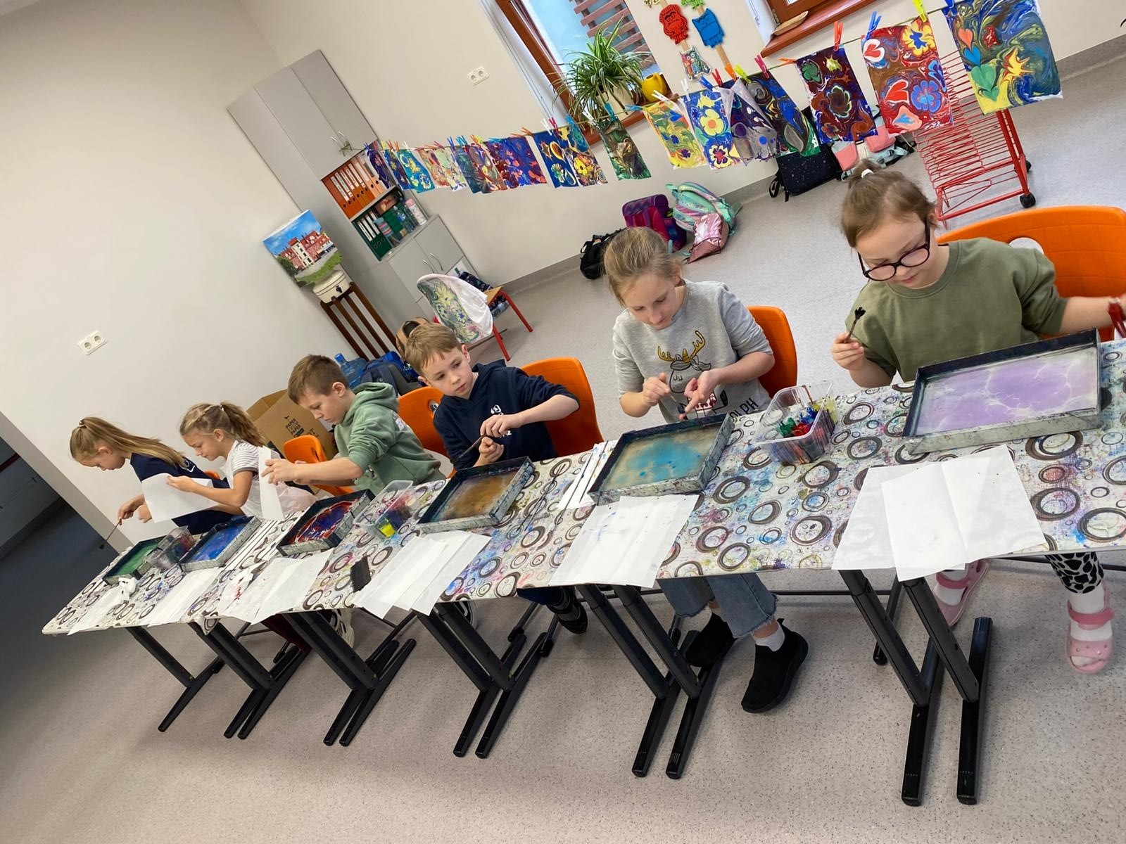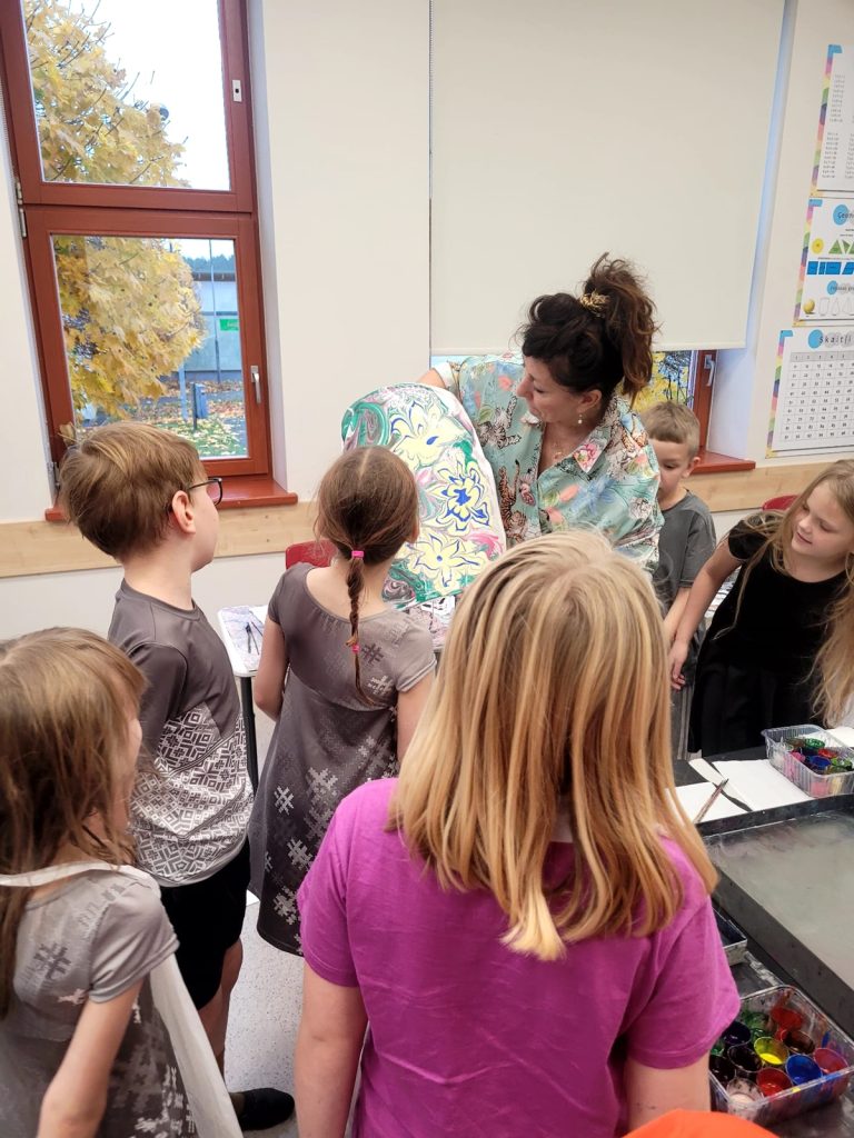 Tā skolēnam bija, kā rotaļa un meditācija, kur katrs skolēns veidoja savu mākslas darbu ūdenī, tad to pārcēla uz papīra, izveidojot unikālu glezniņu.