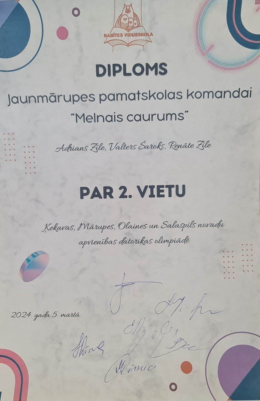 5. martā Jaunmārupes pamatskolas komanda startēja Ķekavas, Mārupes, Olaines un Salaspils novadu apvienības komandu datorikas olimpiāde. Šādā formātā un klašu grupās olimpiāde norisinājās pirmo reizi. Dalībnieku komanda bija jāizveido no trīs skolēniem, kur viens skolēns ir no 7. klasēm, otrs no 8. klasēm un trešais ir no 9. klašu grupas. Jaunmārupes pamatskolas komanda izveidojās no 7.c klases skolēna Adriana Zīles, 8.a klases skolēna Valtera Šaroka un 9.b klases skolnieces Renātes Zīles. Komandai, gatavojoties olimpiādei, jau divas nedēļas pirms olimpiādes norises bija jāizveido prezentācija par savu skolu. Skolēni kopā ar datorikas skolotāju Madaru Romanovsku izveidoja prezentāciju, sasaistot mūsu Jaunmārupes pamatskolu ar “Marvel” supervaroņiem. Olimpiādes dienā skolēniem bija jāveic zināšanu pārbaudes Kahoot! tests un jāizlozē valsts, par kuru izveidot prezentāciju (par Meksiku) un uzreiz to prezentēt citām grupām. Skolēniem lieliski veicās ar uzdevumiem un kopumā Jaunmārupes pamatskolai godalgotā 2. vieta kopvērtējumā no septiņām komandām, kuras bija no Baložu vidusskolas, Olaines 1. vidusskolas, Ķekavas vidusskolas, Baldones vidusskolas, Mārupes pamatskolas un Babītes vidusskolas.