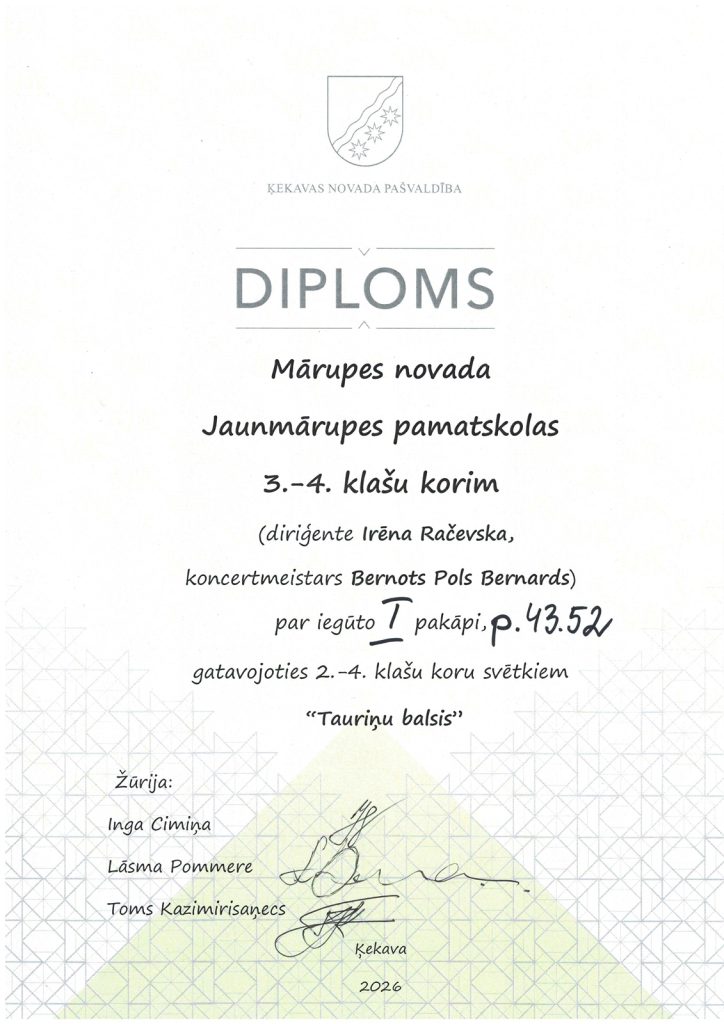 26. martā notika Latvijas izglītības iestāžu 1.–4. klašu koru svētku “Tauriņu balsis 2026” repertuāra apguves skate. Tā ir nozīmīga gatavošanās svētkiem, kuros jaunākie dziedātāji apgūst kopīgo repertuāru, pilnveido vokālās prasmes un piedzīvo kopdziedāšanas vienojošo spēku. Ļoti lepojamies ar Jaunmārupes pamatskolas 3.-4.klašu kori, kurš kopā ar diriģenti Irēnu Račevsku un koncertmeistaru Bernotu Polu Bernardu ieguva I pakāpes diplomu šajā skatē!