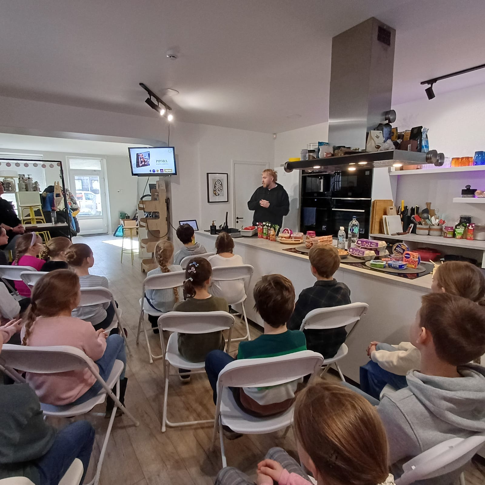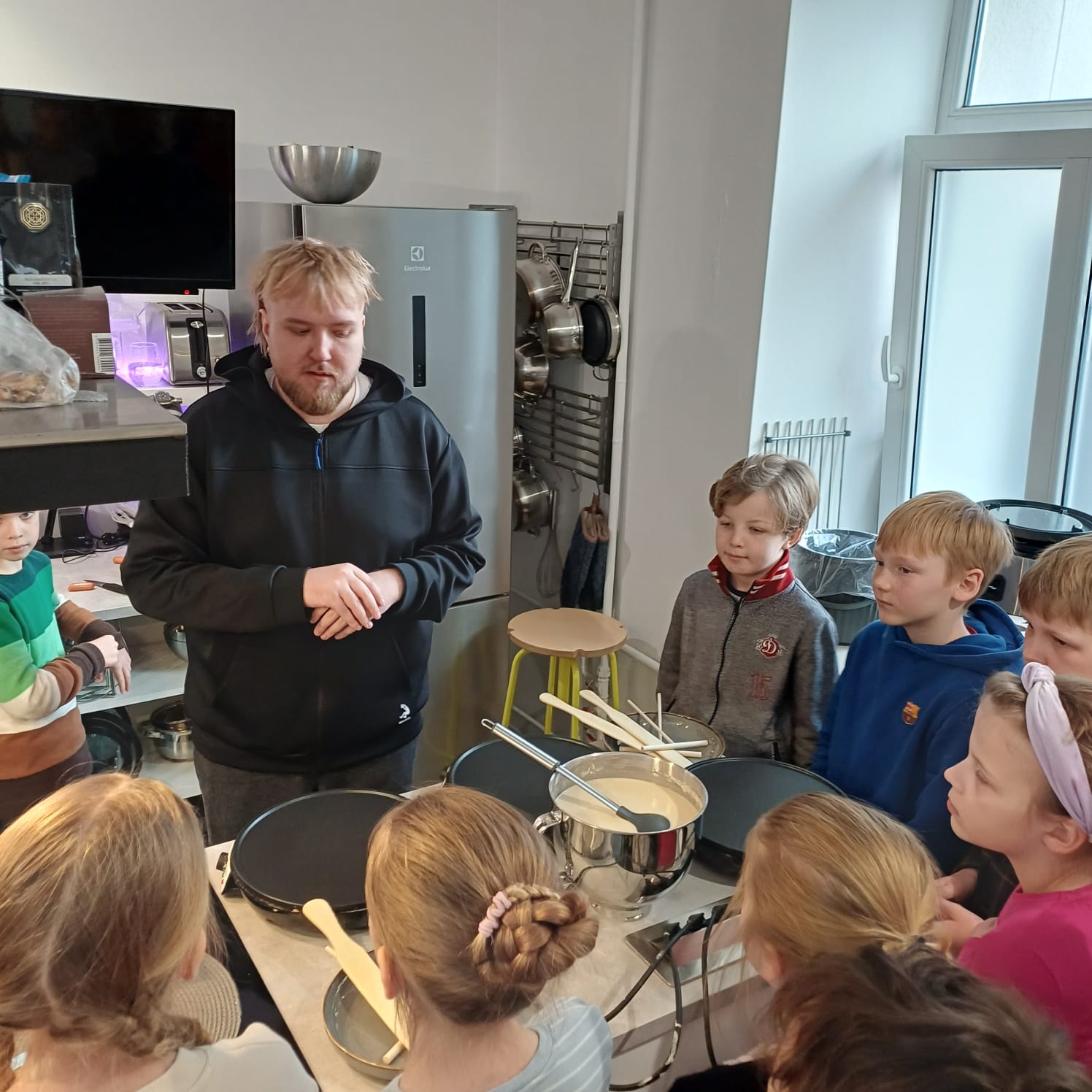 Vislielāko prieku bērniem sagādāja praktiskā darbošanās virtuvē. Katram skolēnam bija iespēja pašam uzcept pankūku un piepildīt to ar gardām piedevām. Pankūkas tika pildītas gan ar Dimdiņi gardumiem, gan ar Kaija ražoto produkciju. Nogaršojām arī Rēzeknes gaļas kombināta ražotos cīsiņus. Virtuvē valdīja rosība, smiekli un patīkams pankūku aromāts.