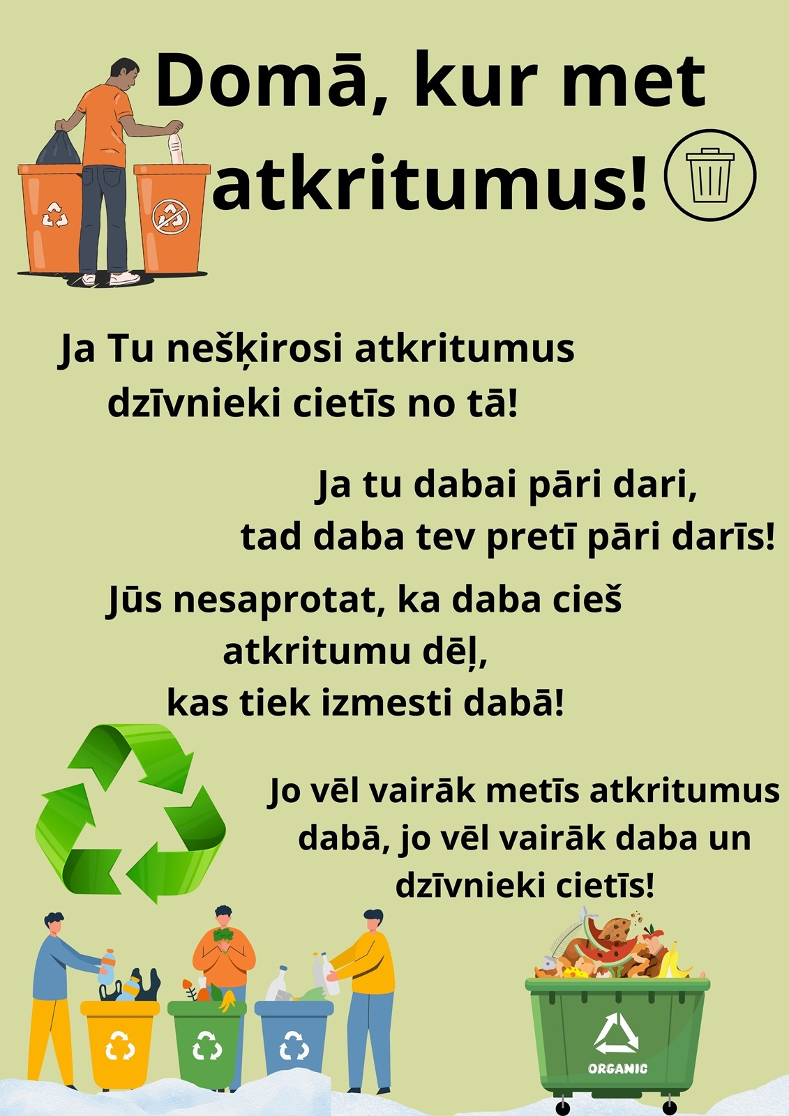 Strādājot grupās, skolēni meklēja informāciju par atkritumu apsaimniekošanu savā novadā, pētīja, kādus atkritumu veidus šķirojam skolā un mājās, domāja, kā varētu uzlabot atkritumu šķirošanas iespējas, kā pievērst apkārtējo cilvēku uzmanību šķirošanai.
