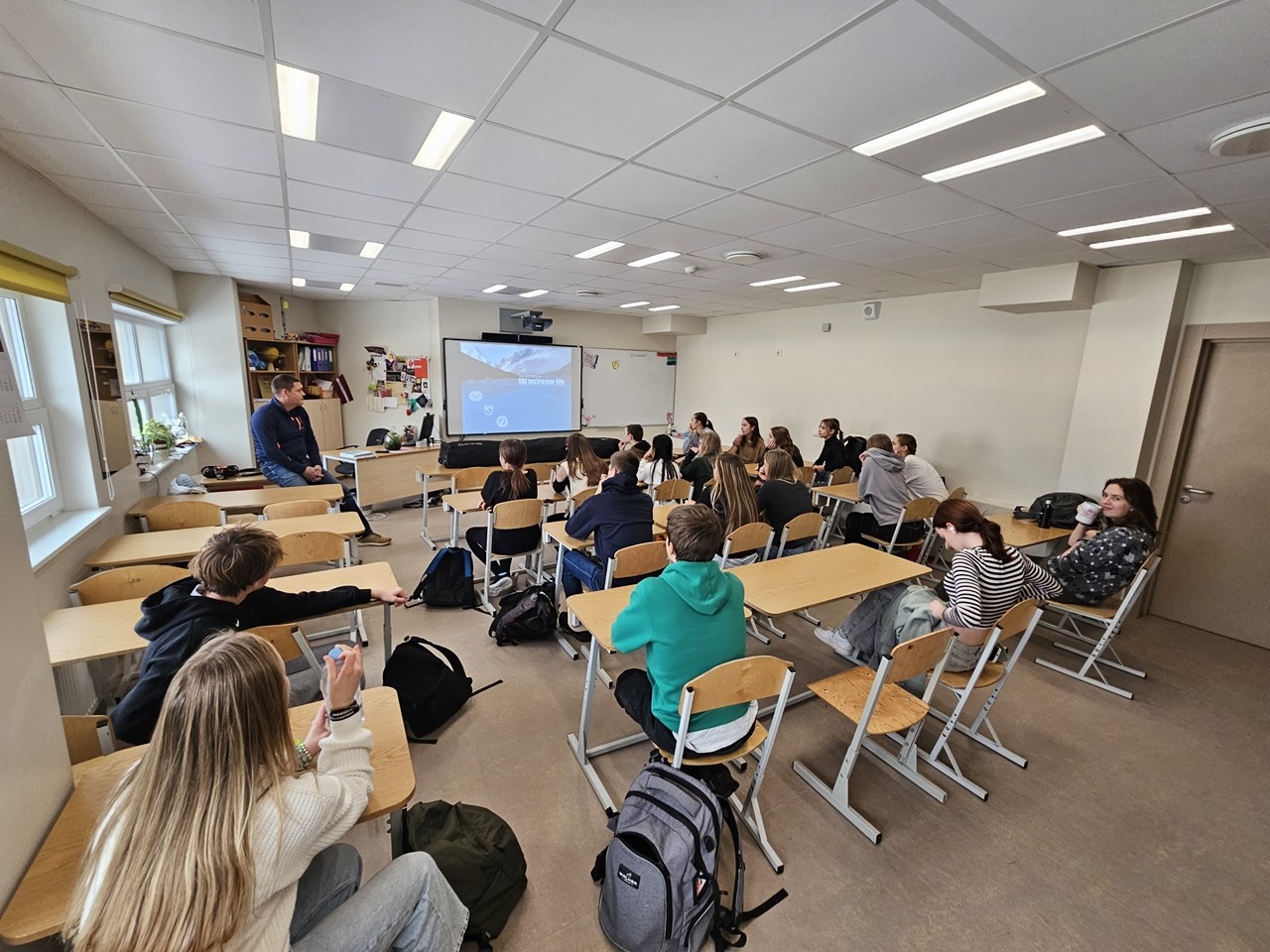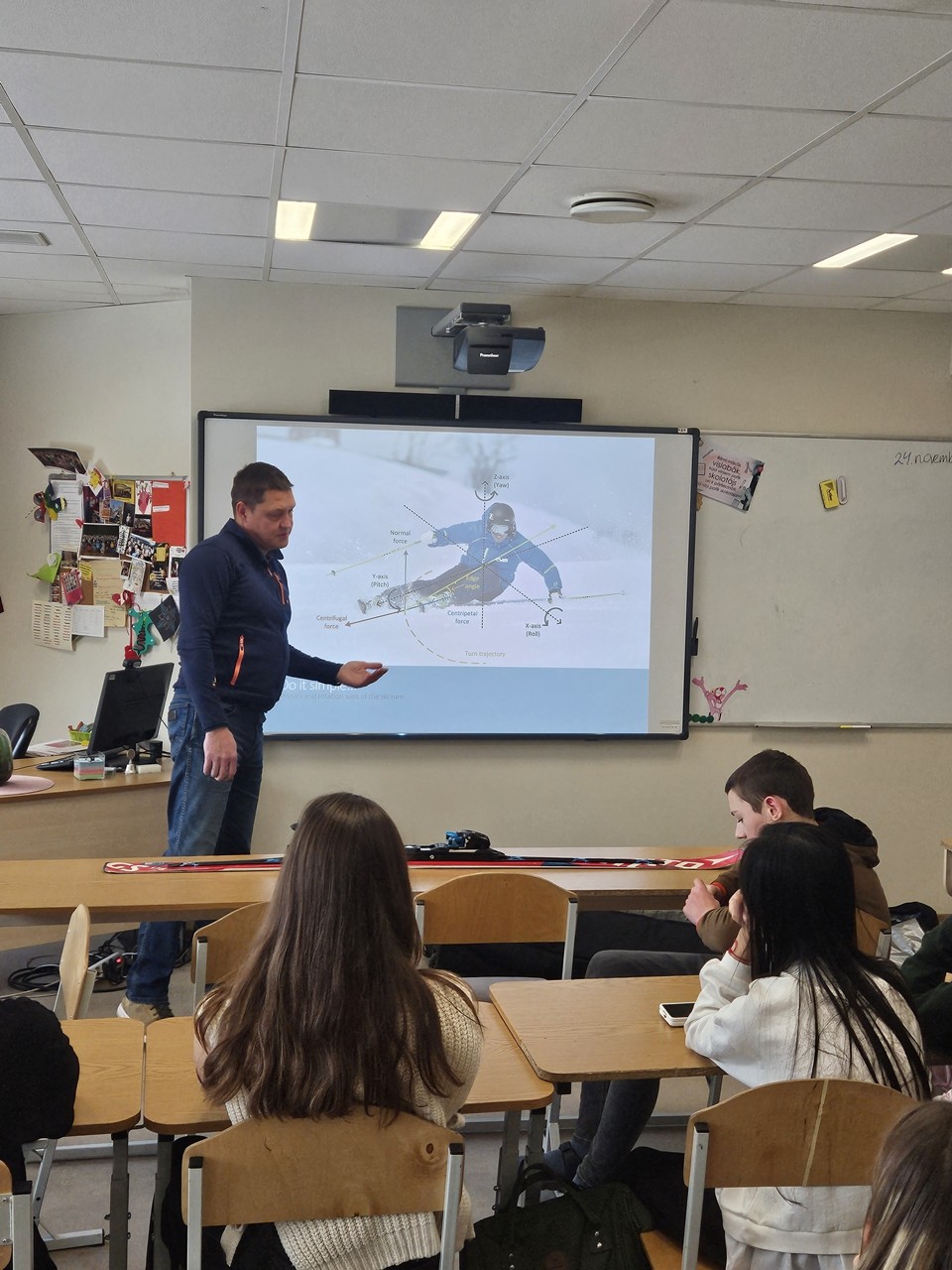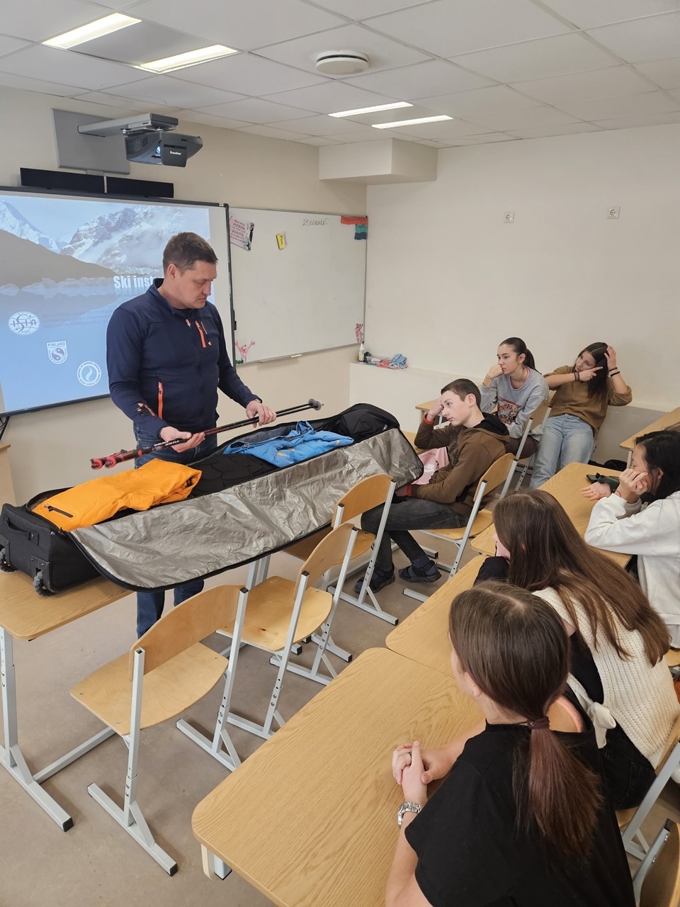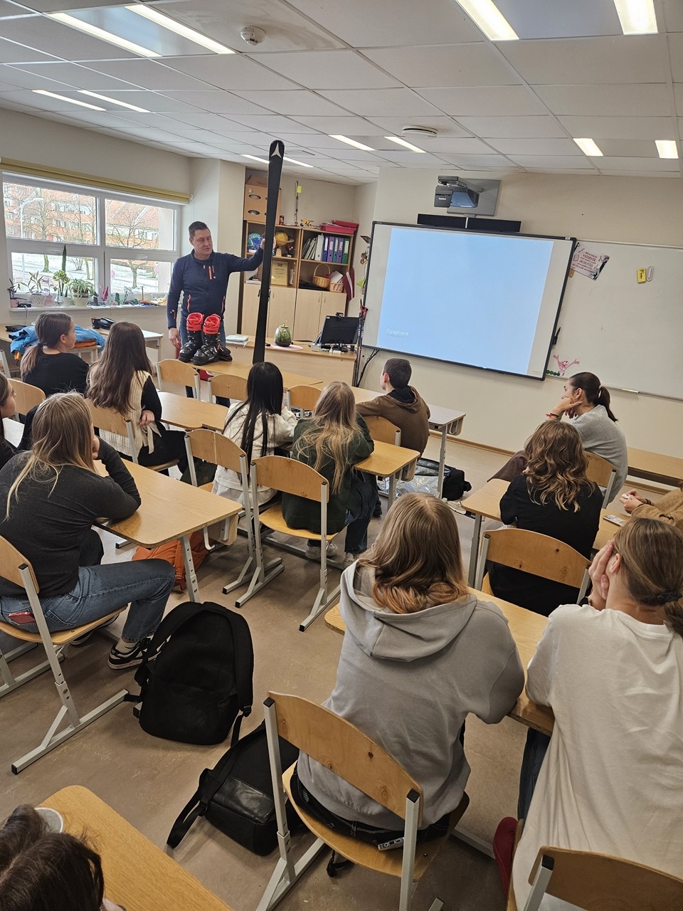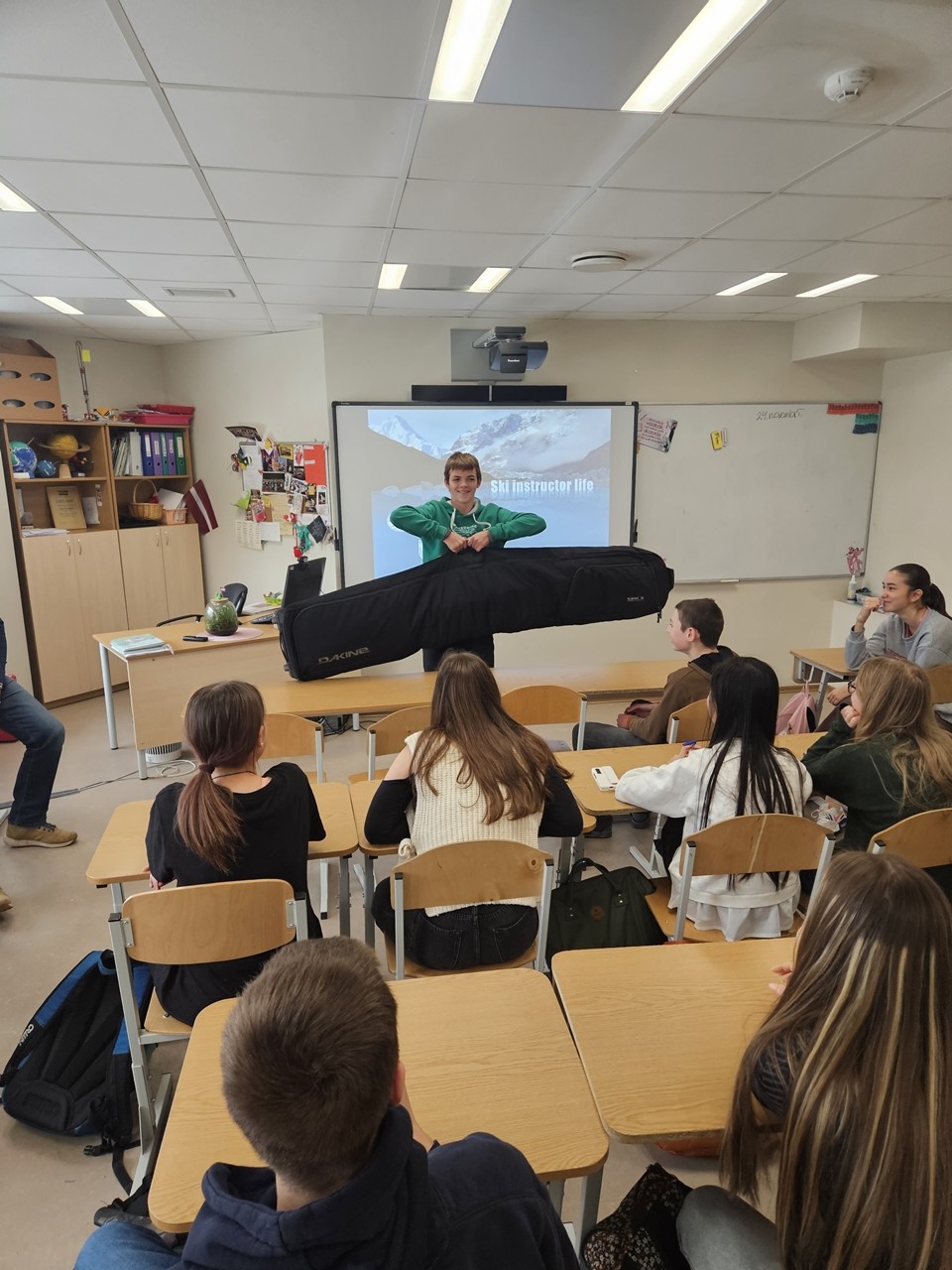 Sniegotā piektdienā, klases stundā, pie 8.a klases viesojās Rebekas tētis- Juris Rudzītis, kurš skolēnus iepazīstināja ar savu darbu un hobiju- kalnu slēpošanas instruktora profesiju. Viņš savu darbu veic gan tepat Latvijā, gan arī Šveices kalnos.