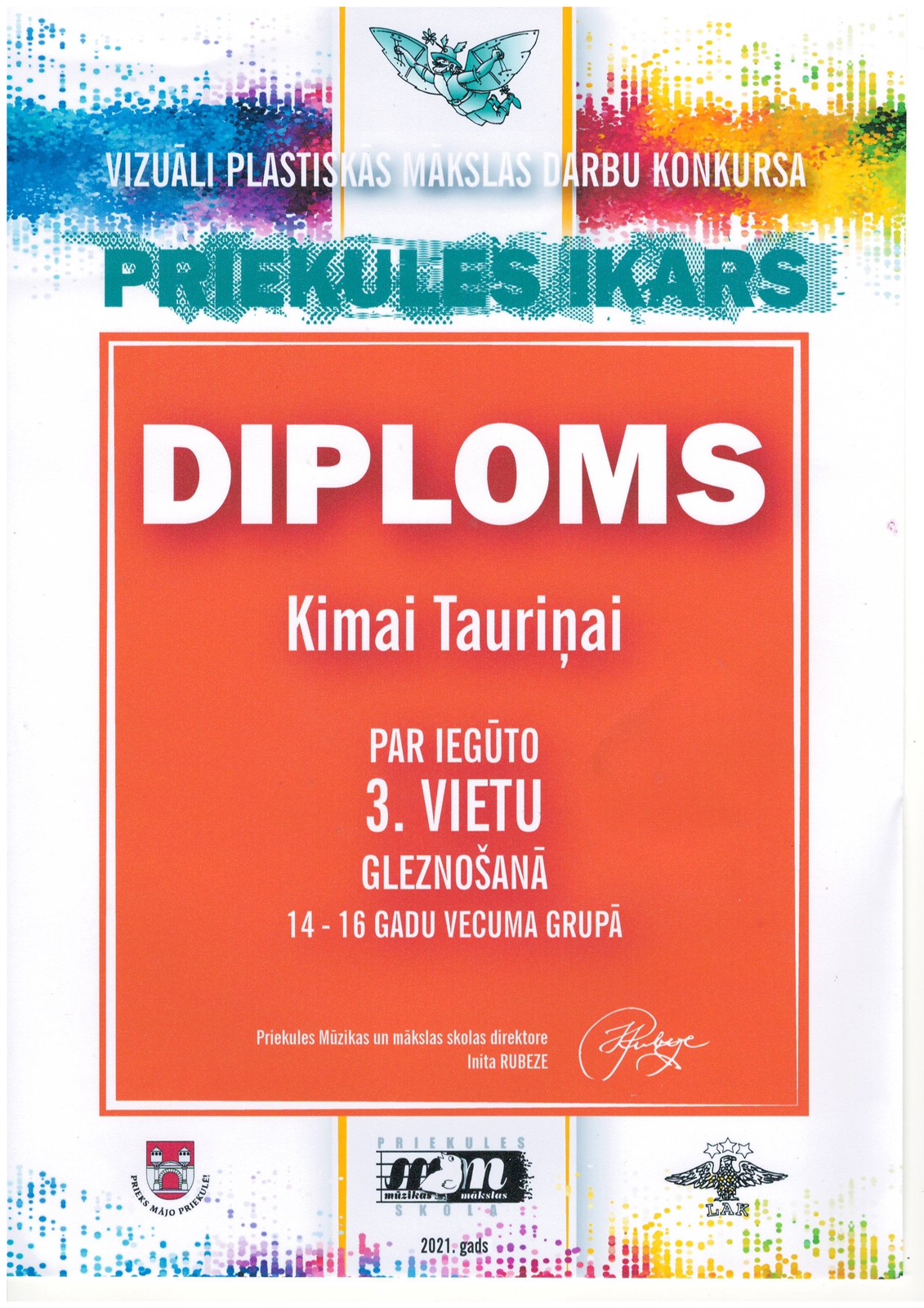 • Kima Tauriņa ieguva diplomu par godalgoto 3. vietu gleznošanā 14.-16. gadu vecumu grupā.