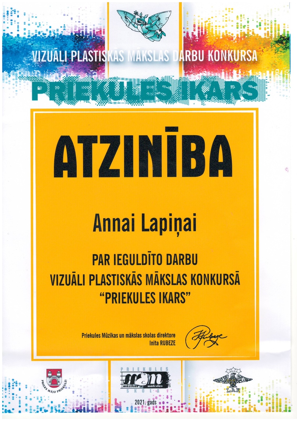 • Anna Lapiņa ieguva atzinību par ieguldīto darbu plastiskās mākslas konkursā “Priekules Ikars”.