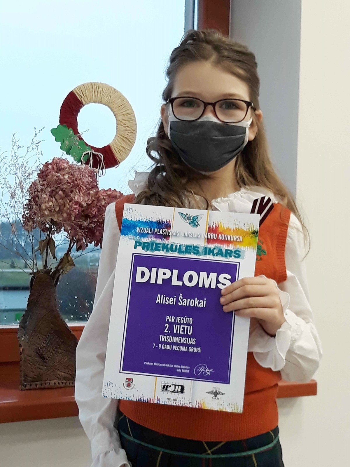 • Alise Šaroka ieguva diplomu par godalgoto 2.vietu trīsdimensijas 7.- 9. gadu vecumu grupā.