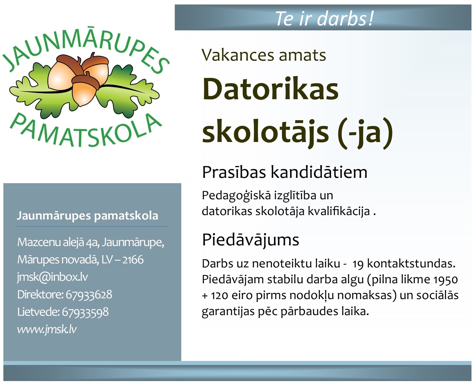 Aicinām darbā datorikas skolotāju