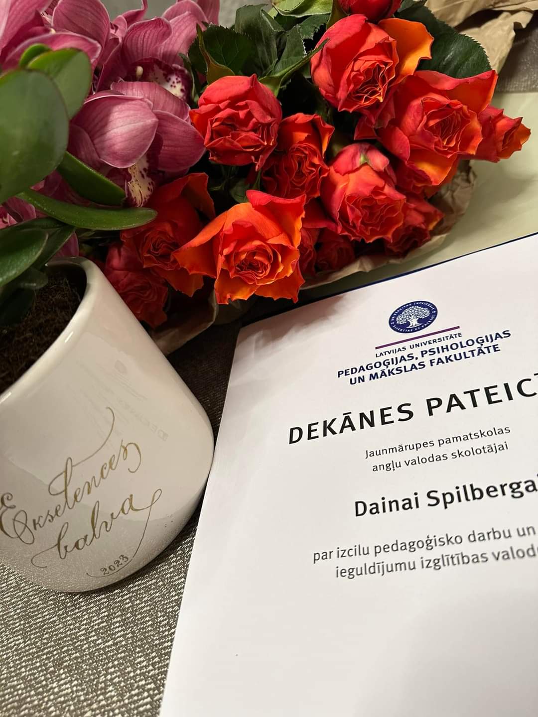 Dainai Spilbergai – augsts izglītības ekspertu novētējums valstī – “Ekselences balvas” TOP 5 laureāte! Izcils pedagogs darbā ar skolēniem un mentors jaunajiem kolēģiem! Cilvēks ar sirdi, dvēseli un zināšanām, kura arī ārpus darba atrod laiku vadīt dažādus projektus, konkursus un darboties Angļu valodas skolotāju asociācijā! Lepojamies gan skolas, gan novada un valsts līmenī ar mūsu skolas skolotāju Dainu Spilbergu!