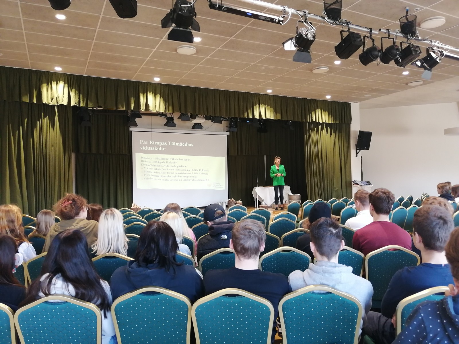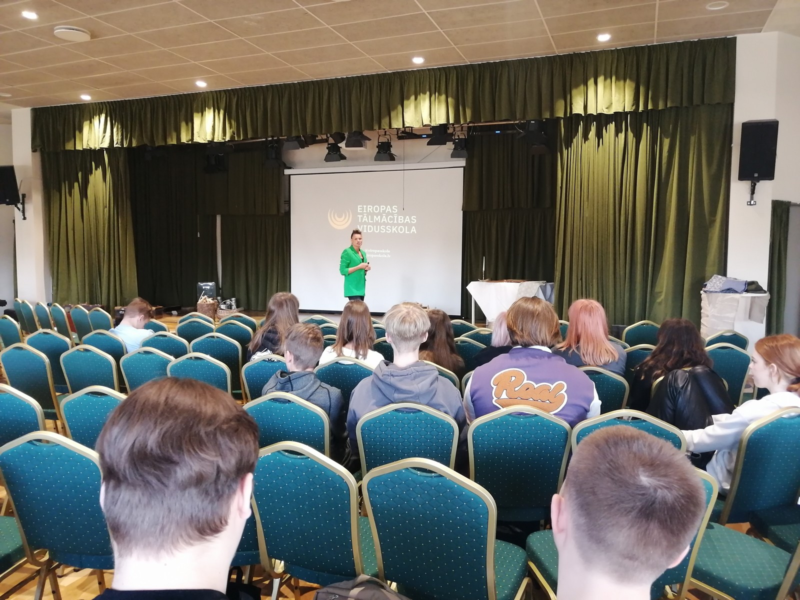 2022.gada 19.aprīlī mūsu skolā ciemojās Eiropas tālmācības vidusskolas direktora vietniece, vieglatlēte Madara Onužāne-Saliņa, kura 8. un 9.klašu skolēniem izstāstīja par skolas pamatprincipiem, mācību grafiku un iespējām, ko tā dod mērķtiecīgiem un uz savu karjeru un izaugsmi orientētiem jauniešim. Tālmācības vidusskola ir ne tikai vieta jaunajiem sportistiem un mūziķiem, bet arī jauniešiem, kuri spēj un var paši organizēt savu laiku un mērķus. Madara Onužāne-Saliņa atbildēja uz jauniešu jautājumiem un iedrošināja viņus domāt par saviem nākotnes plāniem.