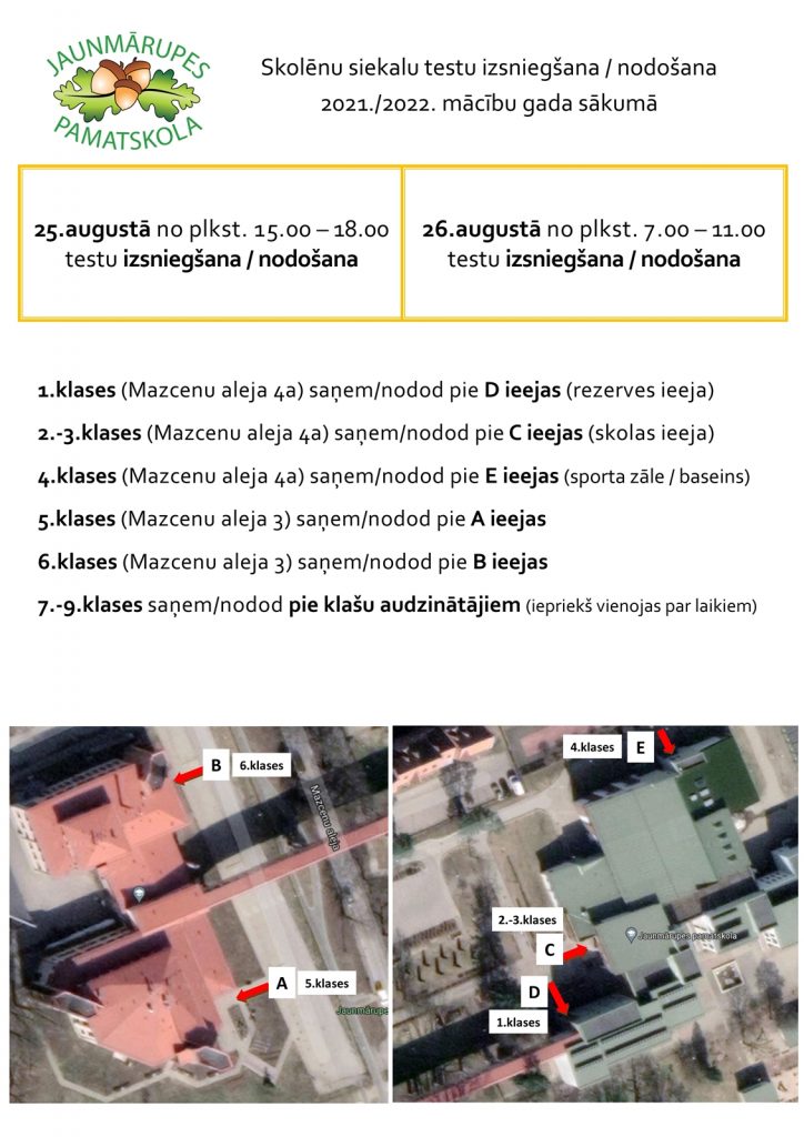 Siekalu testu saņemšana / nodošana Datums Aug 25 2021 Expired! Laiks 15:00 - 18:00 Vieta Jaunmārupes pamatskola Mazcenu aleja 4a un 3, Jaunmārupe, Mārupes novads Kategorijas Mācību process