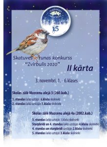 Skatuves runas konkurss “Zvirbulis 2020” II kārta, 1.-6.klasēm Datums Nov 03 2020 Expired! Laiks 10:10 - 14:10 Vieta Jaunmārupes pamatskola, "mazais" korpuss Mazcenu aleja 4a, Jaunmārupe, Mārupes novads Kategorijas Olimpiādes un konkursi