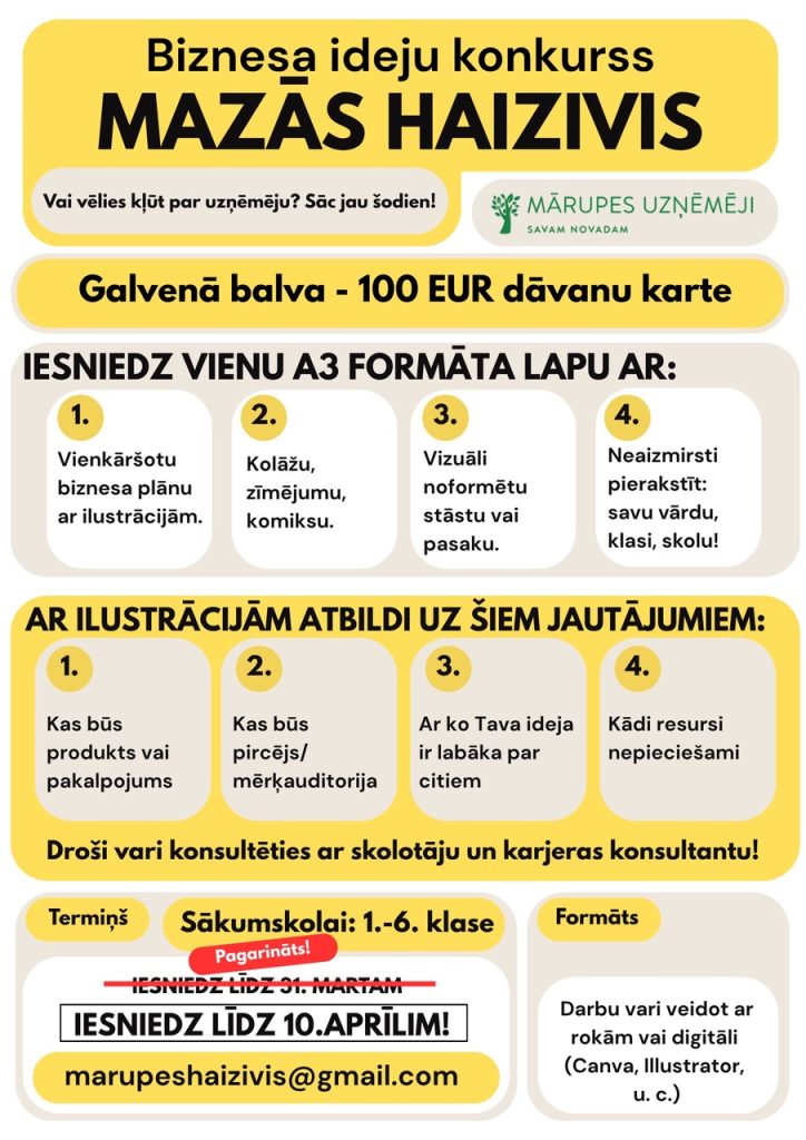 Papildus “Lielajām Haizivīm”, tiek rīkots arī “Mazās haizivis” 1.-6. klasei. Uzdevums ir attālināti izveidot plakātu ar biznesa ideju. Ideja jāiesniedz līdz 10. aprīlim uz e-pastu!