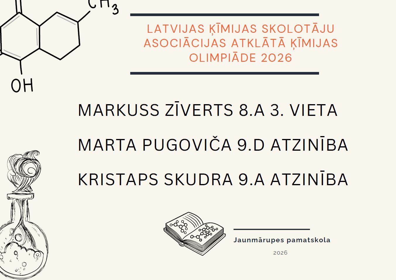 Ar lielu prieku un lepnumu informējam, ka mūsu skolas skolēni guvuši izcilus rezultātus valsts līmenī Atklātajā ķīmijas olimpiādē 8.–12. klašu izglītojamiem: