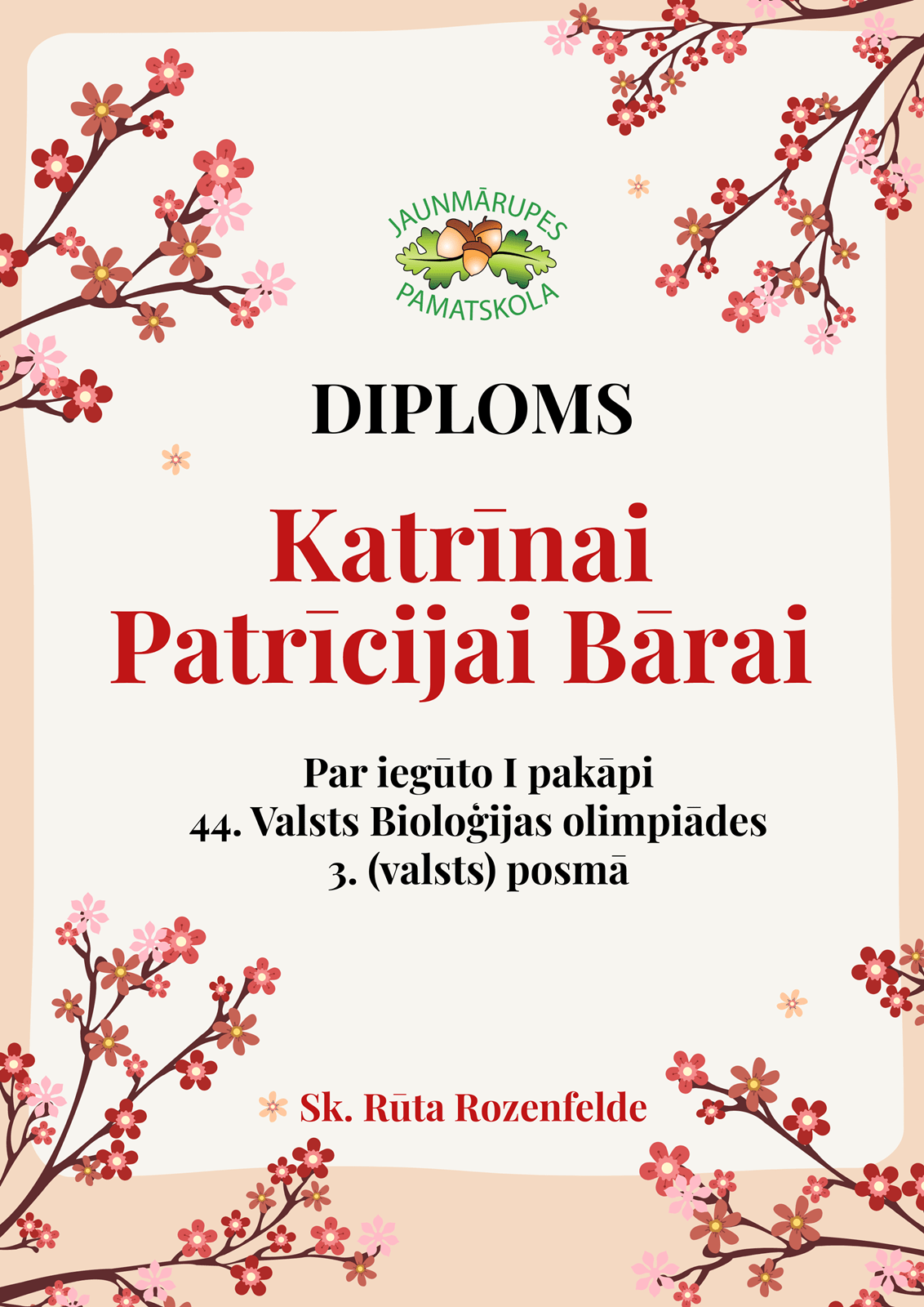 Paldies Katrīnai par Jaunmārupes pamatskolas vārda nešanu Latvijā, gūstot 44. Valsts Bioloģijas olimpiādes 3. posmā 1. pakāpi, sacenšoties ar labākajiem no labākajiem! Lepojamies, un novēlām turpināt ceļu uz nospraustajiem karjeras mērķiem ar tikpat lielu cīņas sparu un zinātkāri!