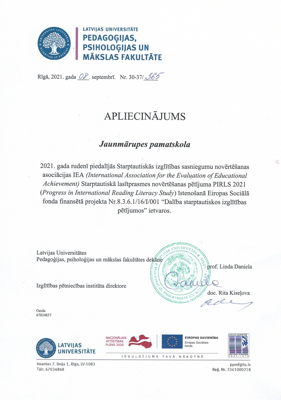 Latvijas Universitātes Izglītības pētniecības institūts izsaka lielu pateicību Jaunmārupes pamatskolai par dalību Starptautiskajā lasītprasmes pētījumā: “Īpaši vēlamies pateikties par Jūsu atsaucību, sapratni, neatlaidību un to, ka spējāt izdarīt neiespējamo. Latvijā pētījums notiek jau 4. reizi. Šoreiz pētījums norisinājās īpaši sarežģītos apstākļos, un vairākkārt tā norise tika apdraudēta gan visas valsts, gan pašvaldību līmenī. PIRLS 2021 pētījumā Latvijā piedalījās 156 skolas un administrācijas pārstāvji, 219 klases, 229 skolotāji un aptuveni 4200 bērnu. Bez jūsu atbalsta un palīdzības mums nebūtu iespējams iegūt ticamus datus par Latvijas 4. klašu bērnu lasītprasmi un Covid-19 pandēmijas ietekmi uz to.”