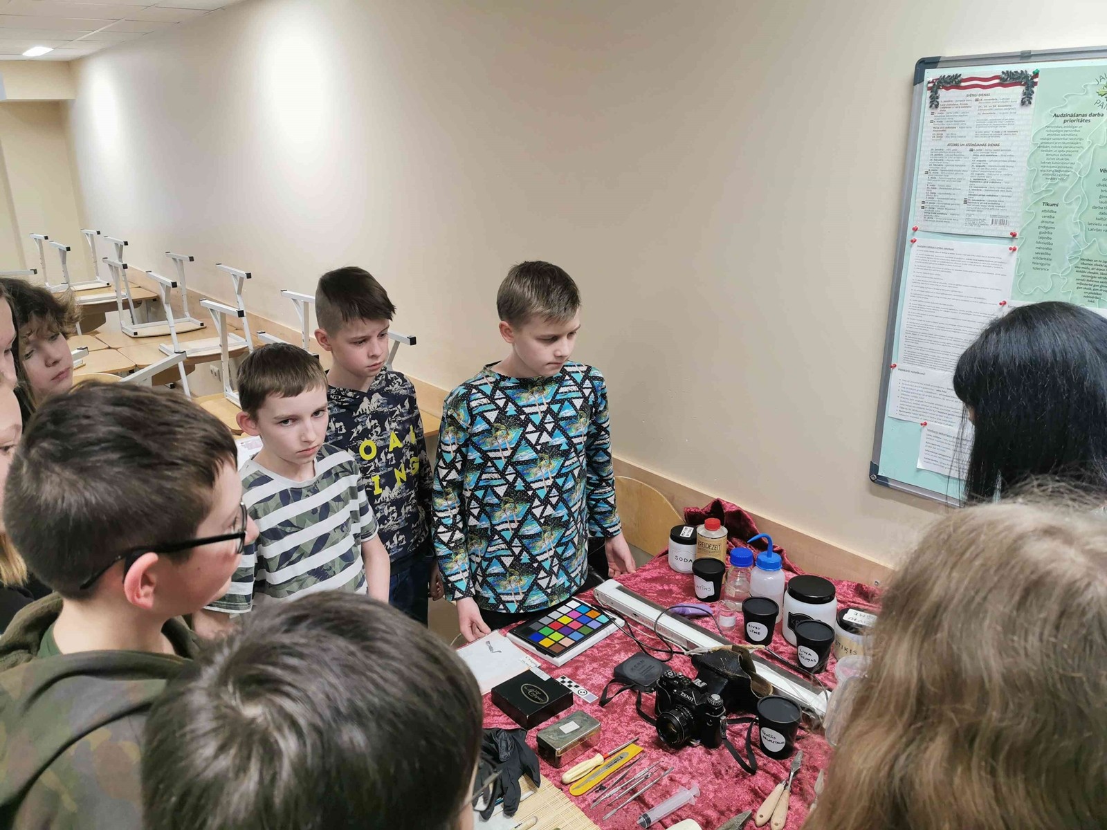 Skolēni nodarbībā piedalījās ar lielu interesi un atzinīgi novērtē iespēju iepazīt šo ar vēsturi saistīto profesiju.