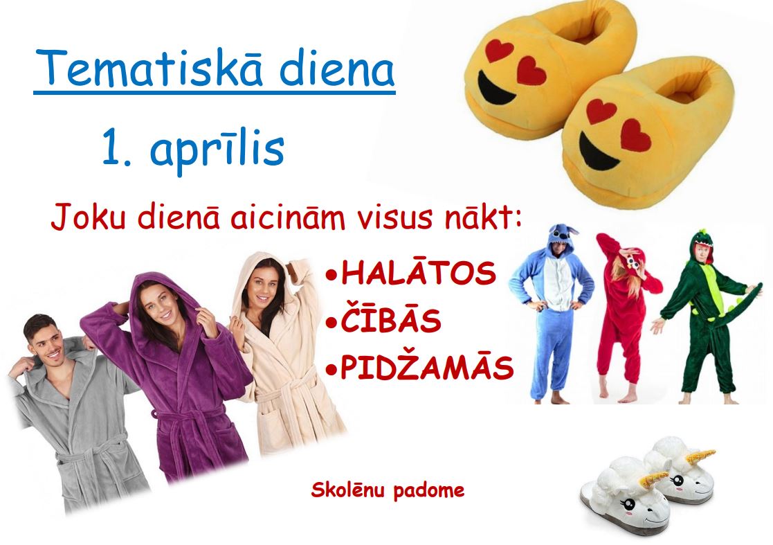 1.aprīlis – Joku diena Jaunmārupes pamatskolā. Kā nu kuro gadu tie joki jokojās mums nosaka Skolēnu padome. 2019.gada Joku diena skola bija pilna ar halātiem, čībām un citiem “brīviem” apģērbiem… Lai brīva prieka un līksmības enerģija!