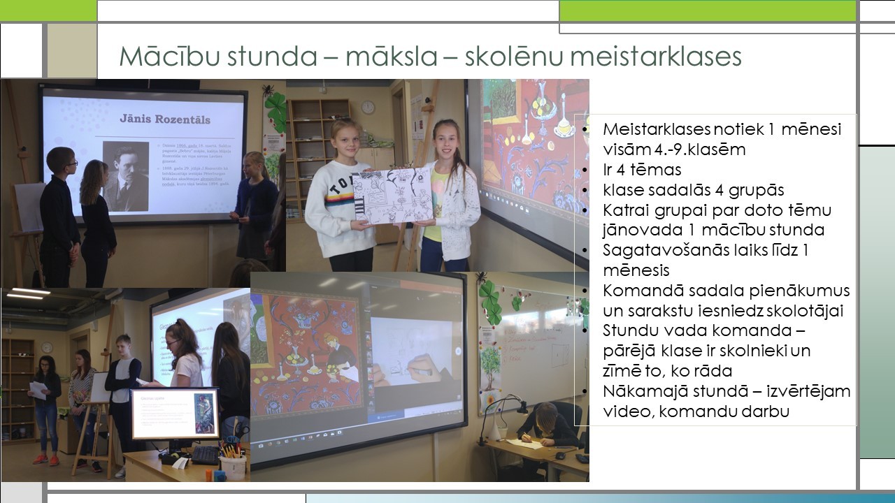 Semināra – darbnīcas galvenais mērķis bija iepazīstināt citu skolu vizuālās mākslas un mūzikas pedagogus ar Baibas un Jolantas kopprojektiem, Jaunmārupes pamatskolas dažādu mācību priekšmetu sadarbības praktiskiem stāstiem. Tika rādīti un atskaņoti daudzi piemēri no mūsu skolas arhīva, radošajiem, muzikālajiem, mākslinieciskajiem kopprojektiem, vizuālajiem piemēriem un mācību stundu pieredzes stāstiem.