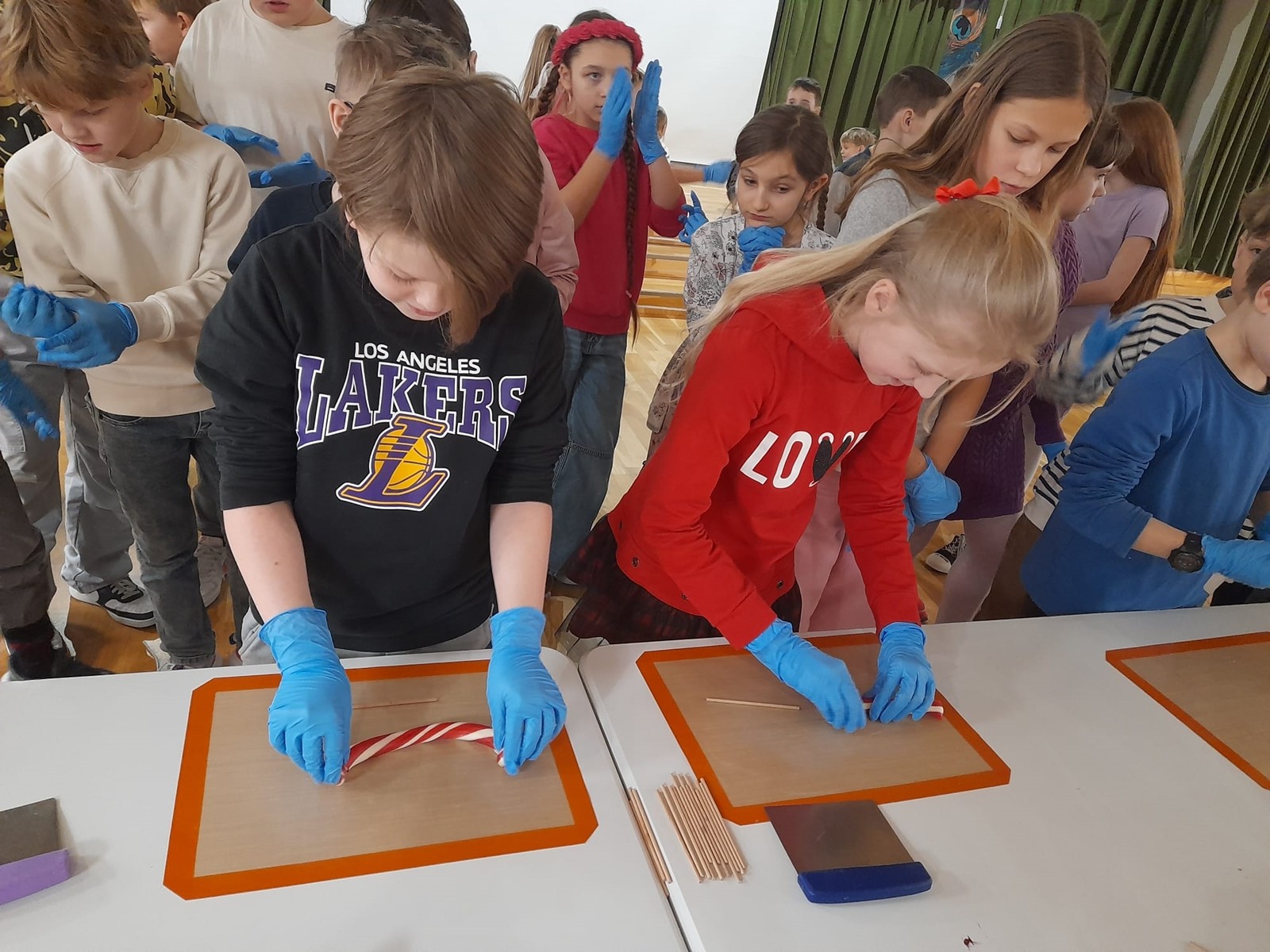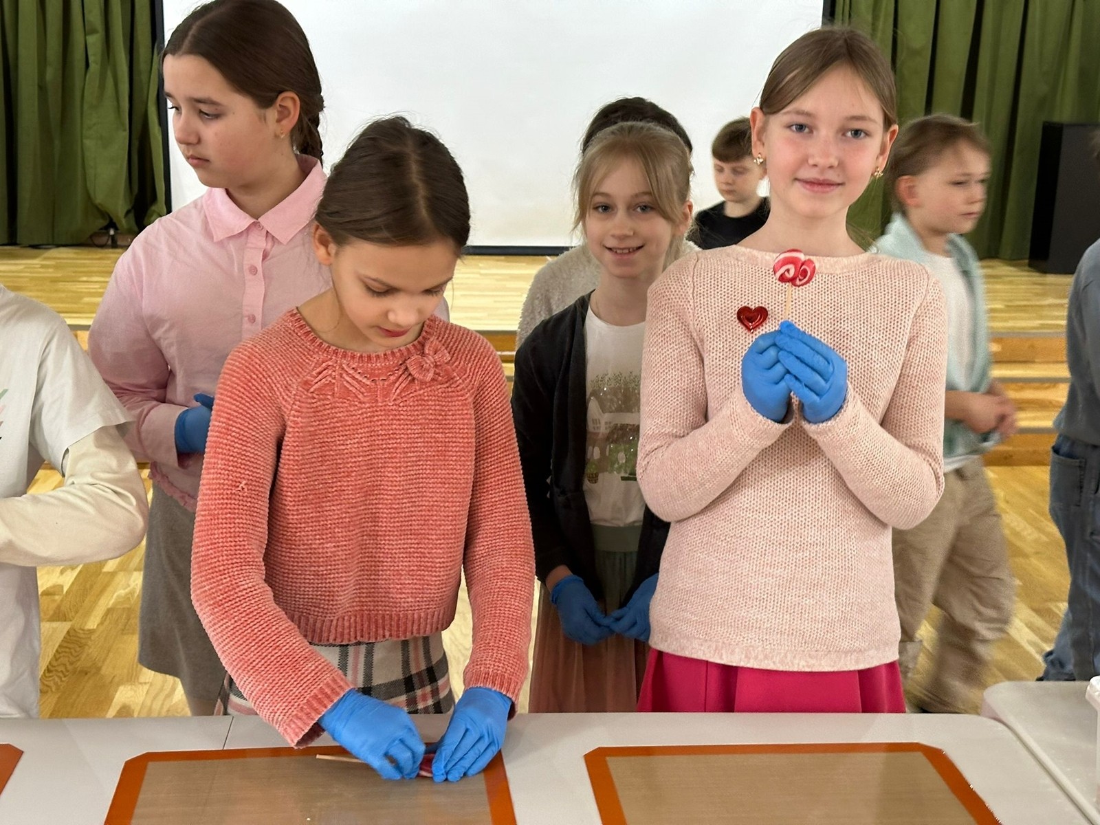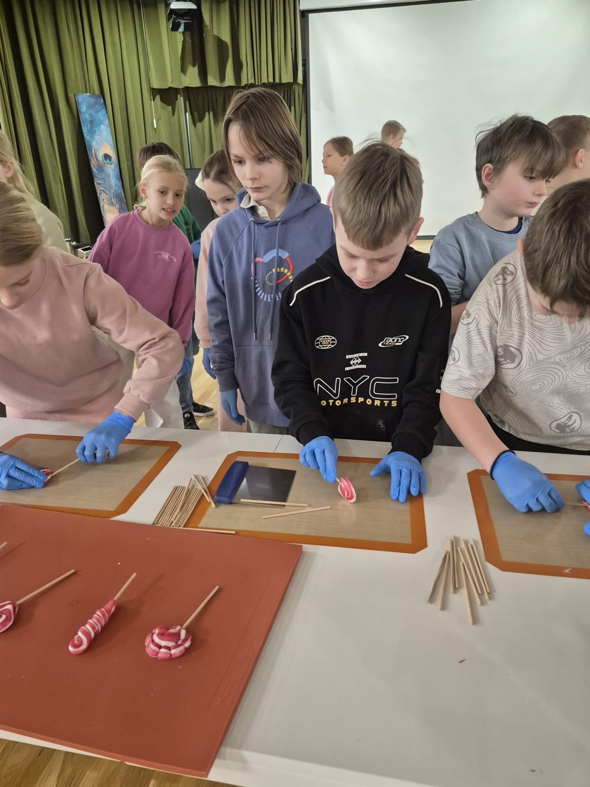 Skolēni veidoja dzērveņu garšas karameles dažādās formās – tvistera, puķītēs, sirsniņās un aplīšos. Darbs prasīja rūpību un pacietību, taču visi ar to lieliski tika galā. Klasesbiedri cits citam palīdzēja un ar prieku rādīja savus skaistos darbiņus.