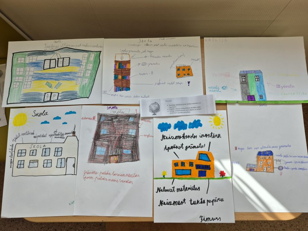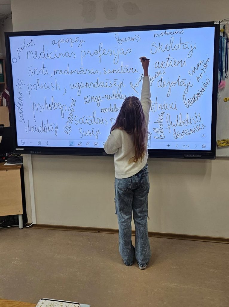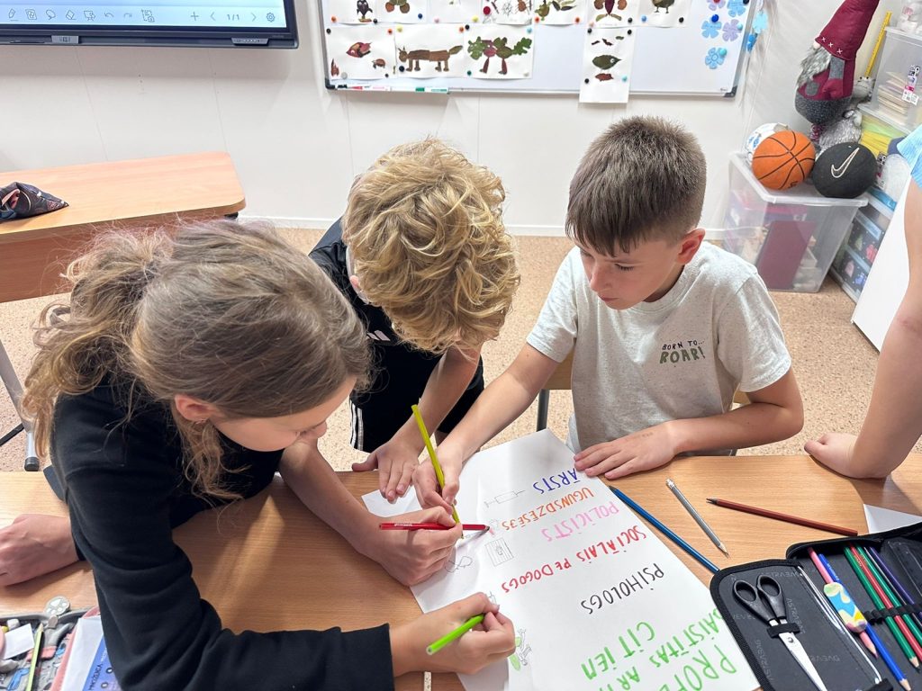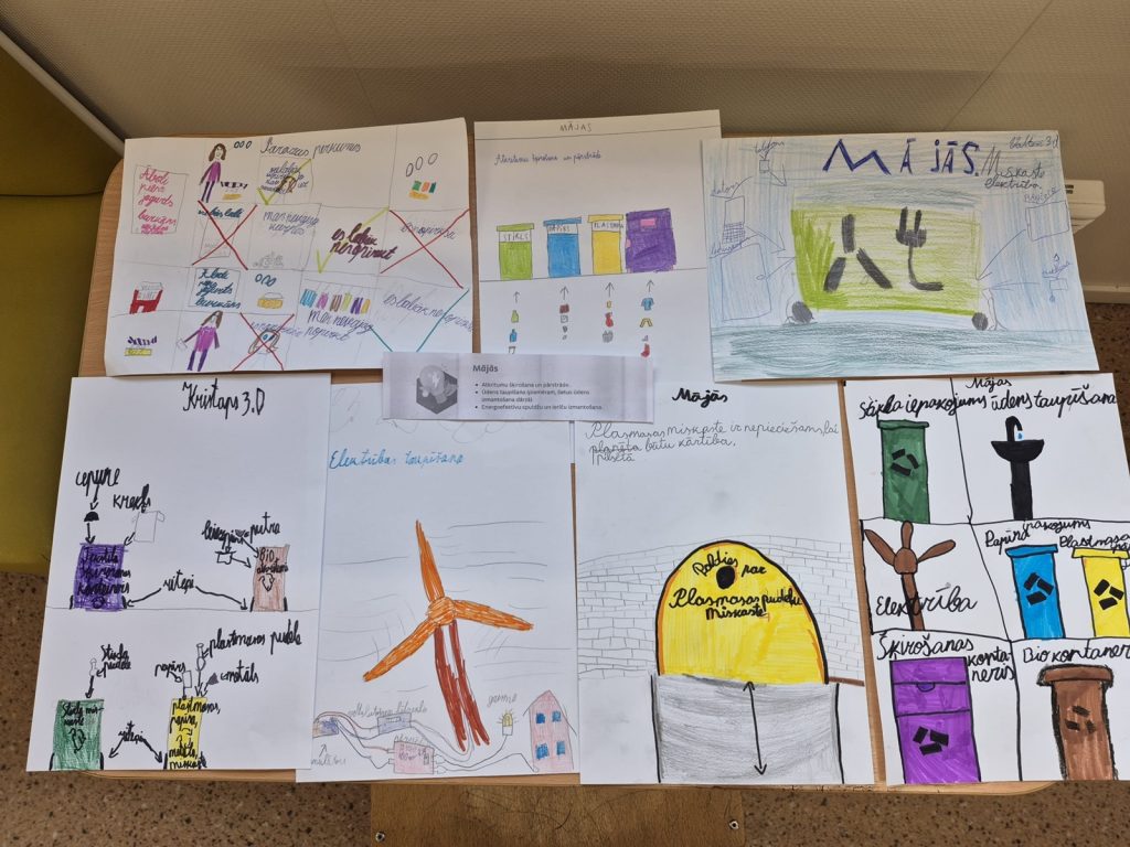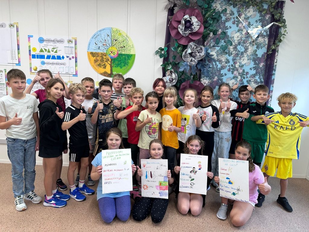 3.a klases skolēni karjeras nedēļas “Zaļā karjera Tavai nākotnei” ietvaros veidoja vizuālo materiālu “Kādas profesijas ir saistītas ar gaisu, ūdeni, zemi, palīdzību un atbalstu citiem”. Skolēni ar interesi un aizrautību strādāja grupās. Patika, ka vajadzēja domāt un sadarboties.