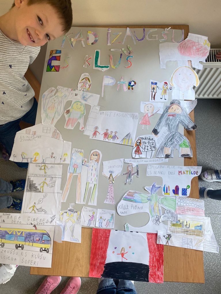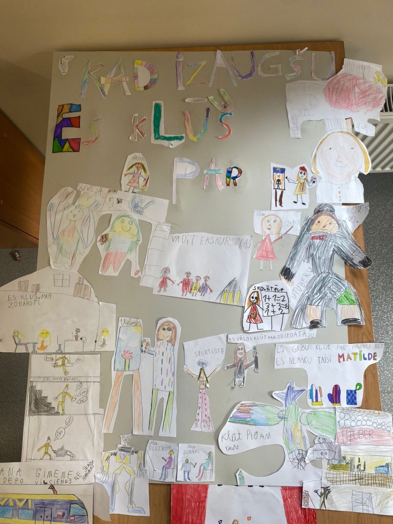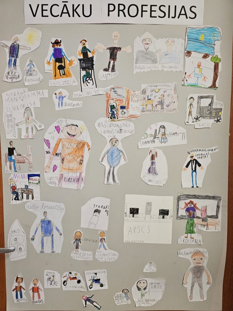 1.e klase Karjeras nedēļas ietvaros gatavoja plakātu par tēmu- Kad izaugšu es kļūšu par….Bērni zīmēja un rakstīja par savām sapņu profesijām, kurās vēlas strādāt, tad kad izaugs lieli. Secinājām to, ka profesijas un karjeras izvēle nemaz nav tik vienkārša, kā arī tās attēlošana uz papīra var būt diezgan grūta. Mūs šodien priecēja arī 3 klases bērni, kuri savus hobijus vizuāli prezentēja ar apģērba palīdzību.