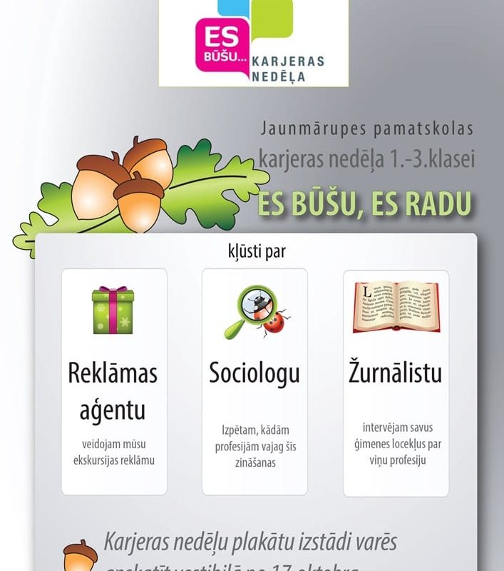 Jaunmārupes pamatskola “Karjeras nedēļas 2016” ietvaros organizē karjeras nedēļas konkursu laika posmā no 3. – 19.oktobrim. Konkursā aicināti piedalīties 5. – 8. klašu. Konkursa mērķis ir mudināt skolēnus iesaistīties skolas dzīves pasākumos, veicināt izpratni par dažādu profesiju specifiku, izpētīt konkrētajai profesijai nepieciešamās iemaņas un mācēt tās pielietot projekta idejas veidošanā, spēt darboties komandā, kā arī iepazīstināt citus ar savu ideju, mācēt to prezentēt un izskaidrot tās unikalitāti.