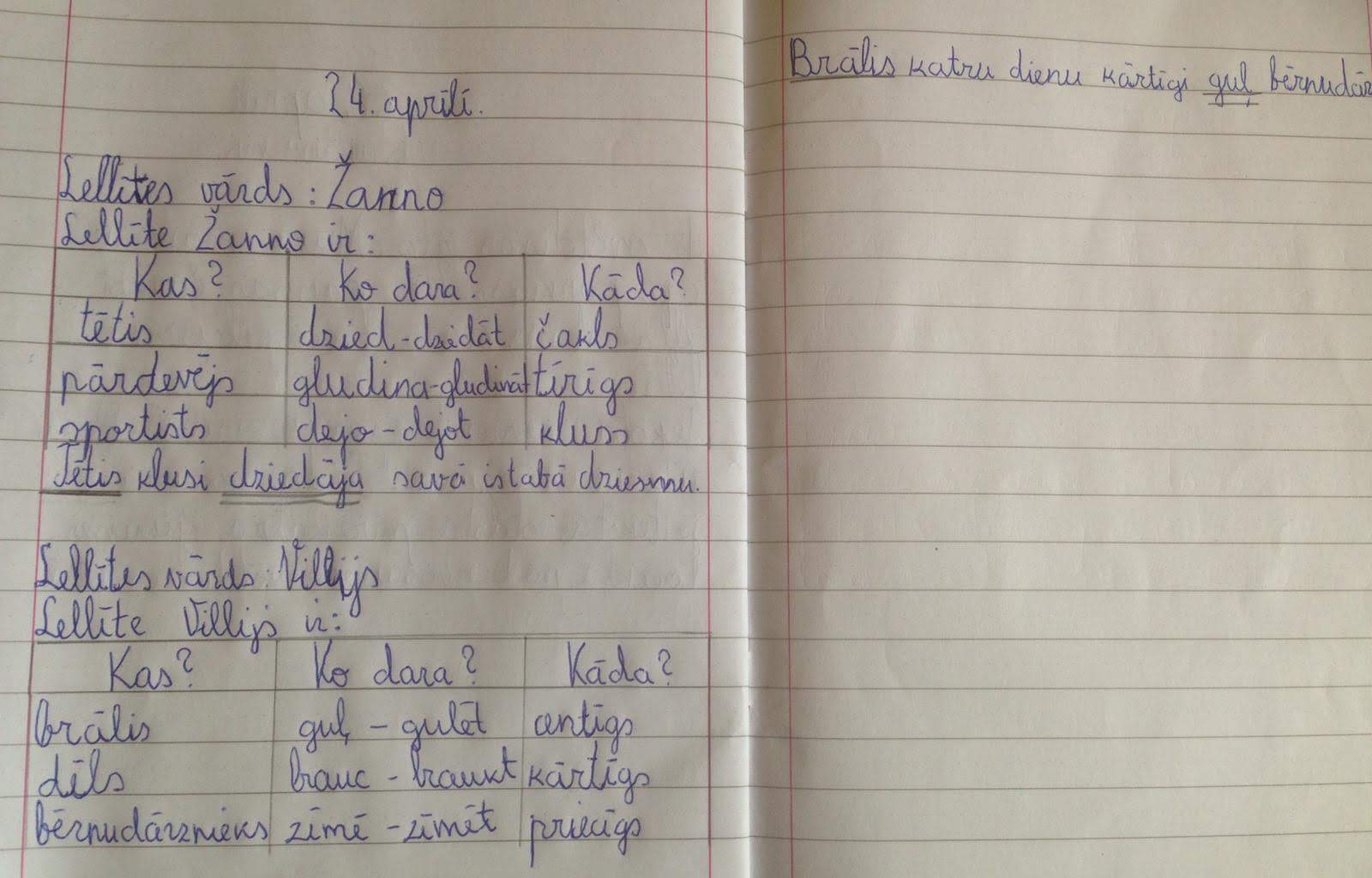 Nedēļas beigās katram skolēnam bija taustāms rezultāts ar mazu stāstu. Bija jāpagatavo koka lellītes. Uzdevumi bija šādi: