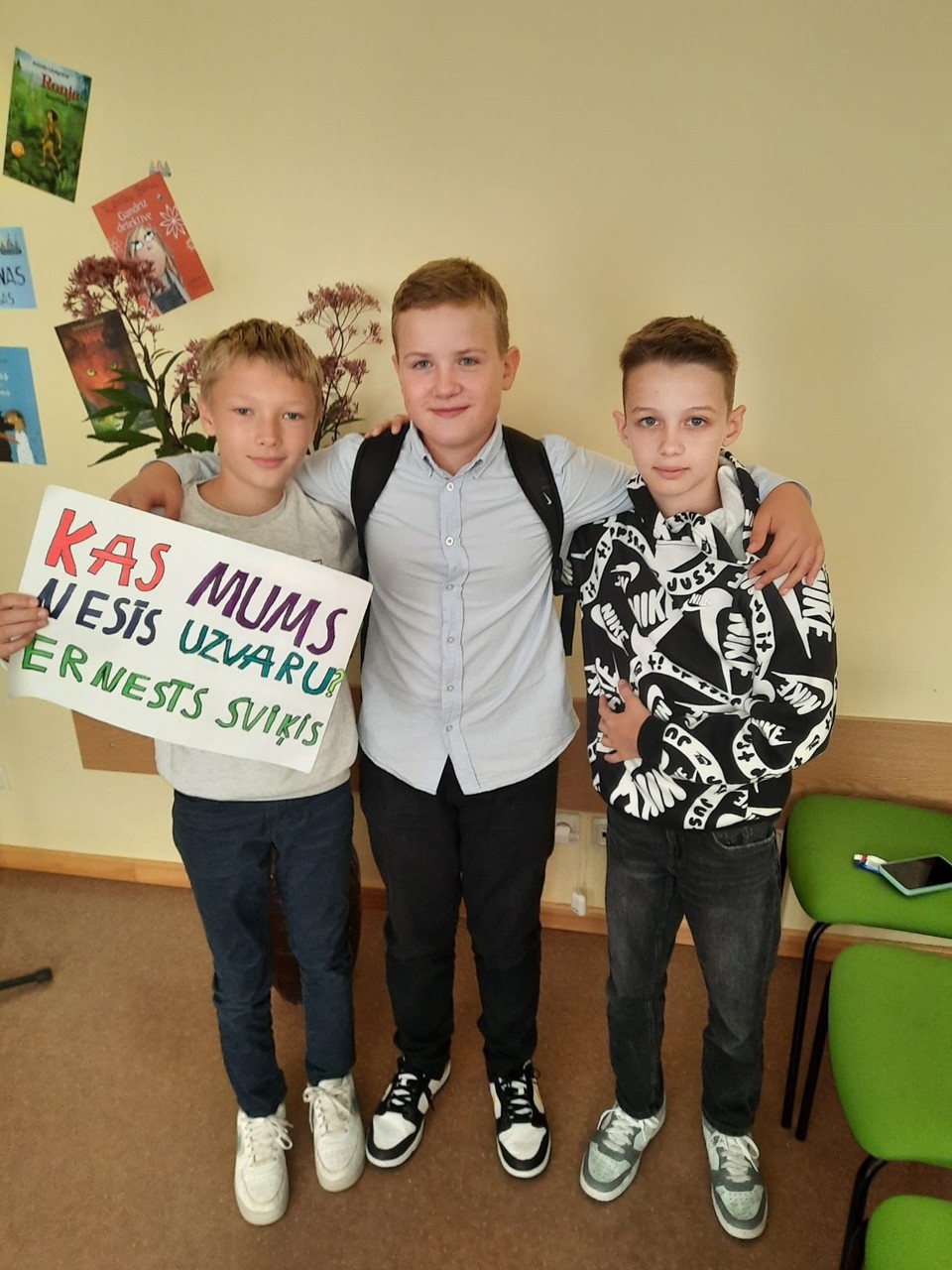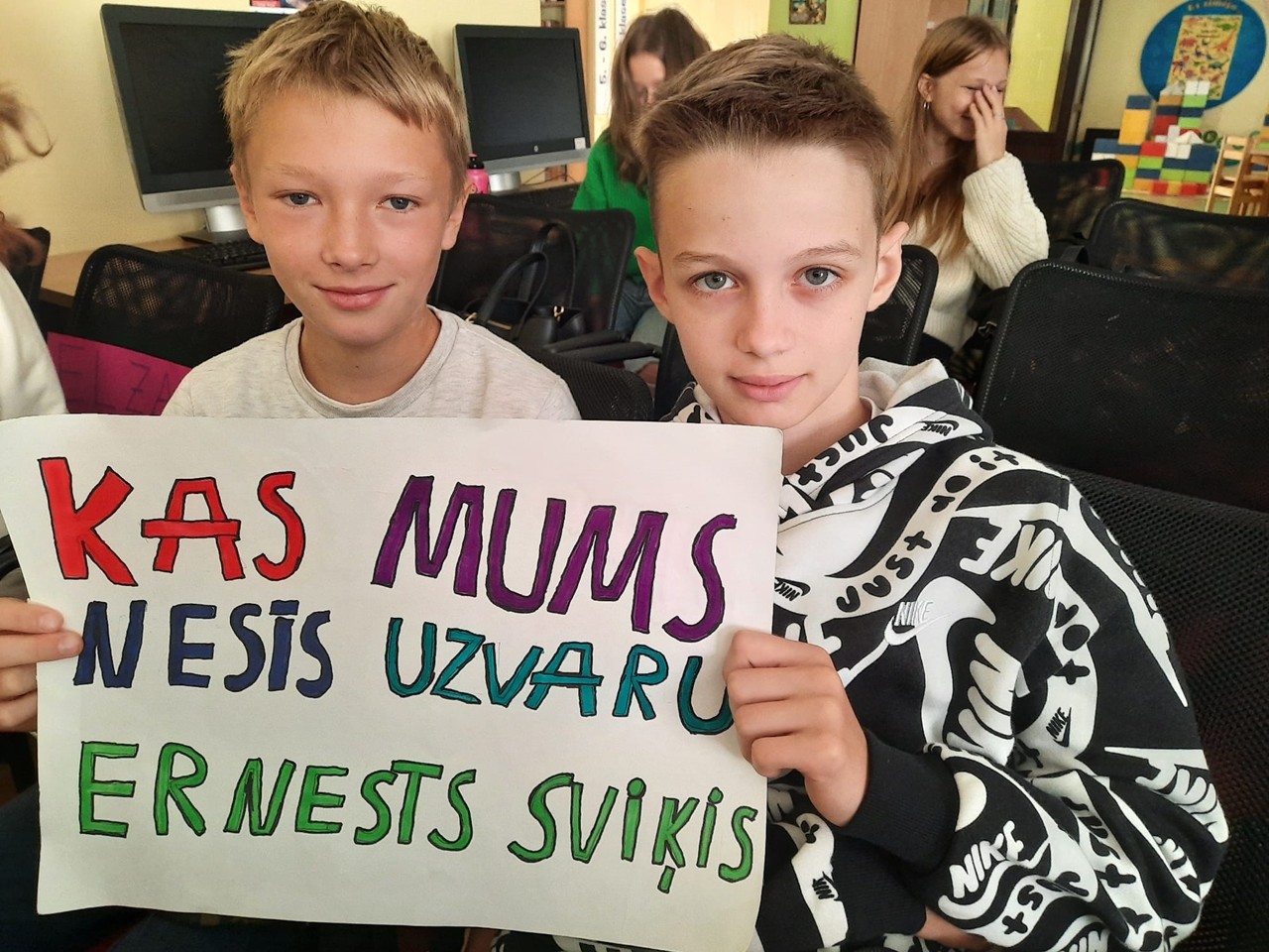 Ernests godam pārstāvēja mūsu skolu un novadu, turklāt tieši Ernestam bija visaktīvākie atbalstītāji un līdzjutēji – klasesbiedri Patriks un Sando, kuri uzmundrināja draugu šajās sacensībās.