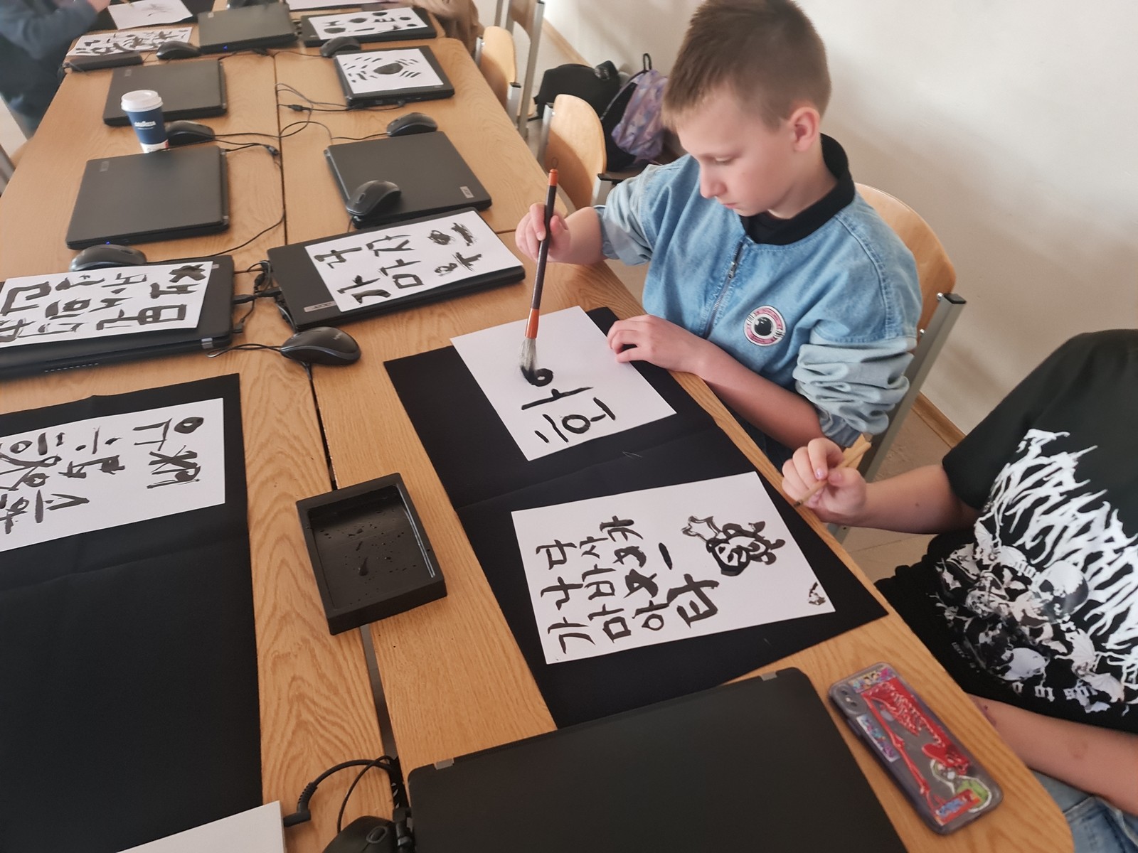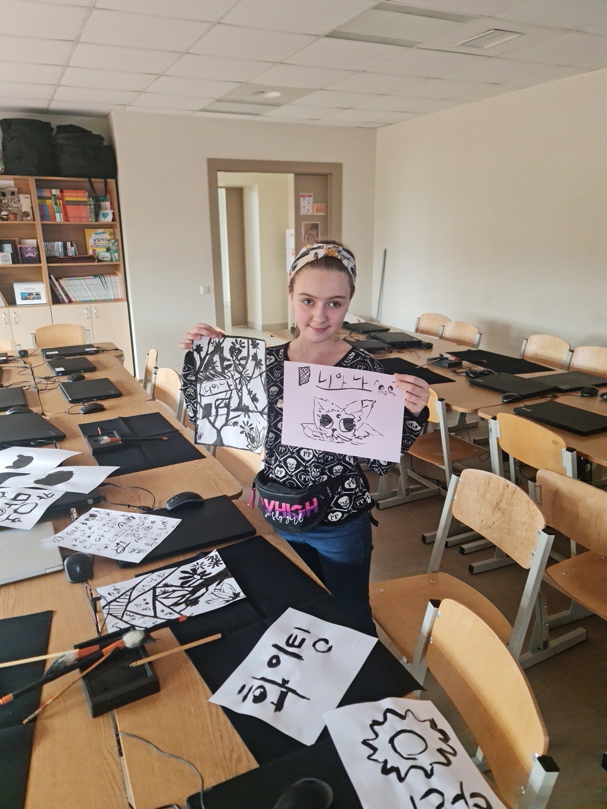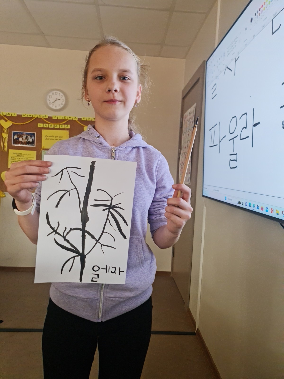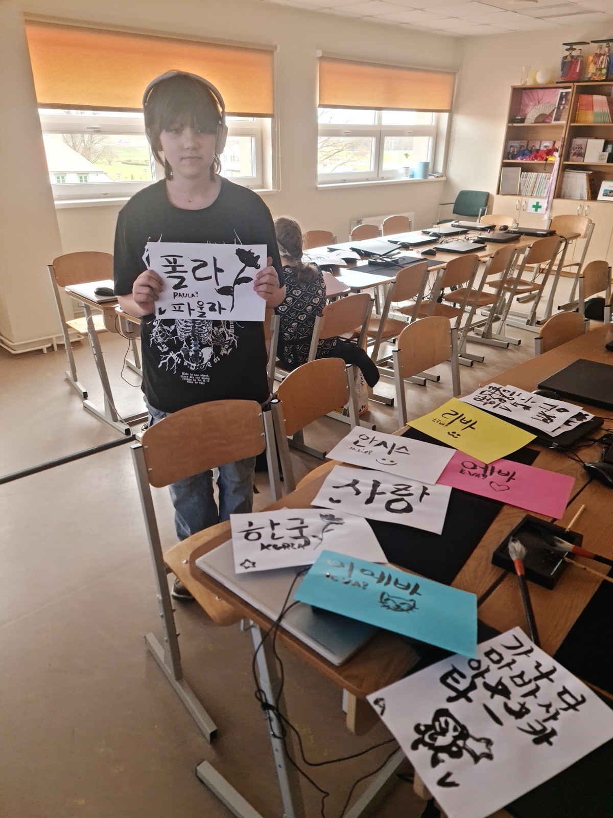 Korejiešu valodas un kultūras pulciņa dalībnieki 12. aprīļa pēcpusdienā izmēģināja savu roku sarežģītajā mākslas un daiļrakstīšanas veidā – 서예 (Sojē) jeb kaligrāfija. Pateicoties Korejas Republikas vēstniecības dāvinātajiem kaligrāfijas komplektiem, skolēni varēja izmēģināt gan rakstīt, gan zīmēt ar plūstošas melnās tintes palīdzību. Kaligrāfija ir viena no papildus prasmēm, kas Korejas darba tirgū aizvien tiek augsti novērtēta. Skaisti un glīti rakstīt nav viegli pat dzimtajā valodā, kur nu vēl uzrakstīt savu vārdu korejiešu valodā ar plūstošu tinti. Bērniem ļoti patika ne tikai uzzināt vairāk par kaligrāfiju, bet to arī pašiem pamēģināt – gan rakstot korejiešu alfabētā 한글 (hangeul), gan zīmējot orientālus zīmējumus pēc paraugiem.