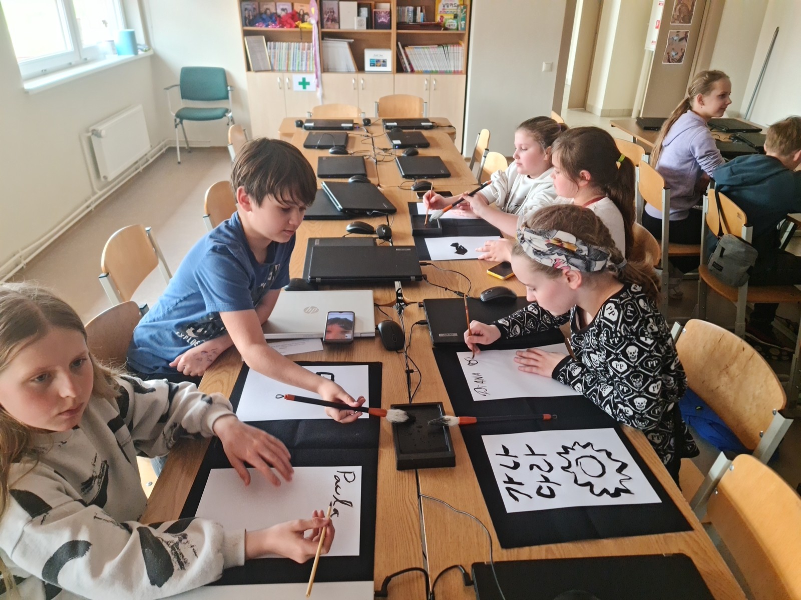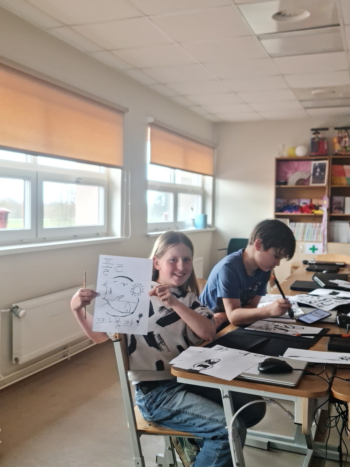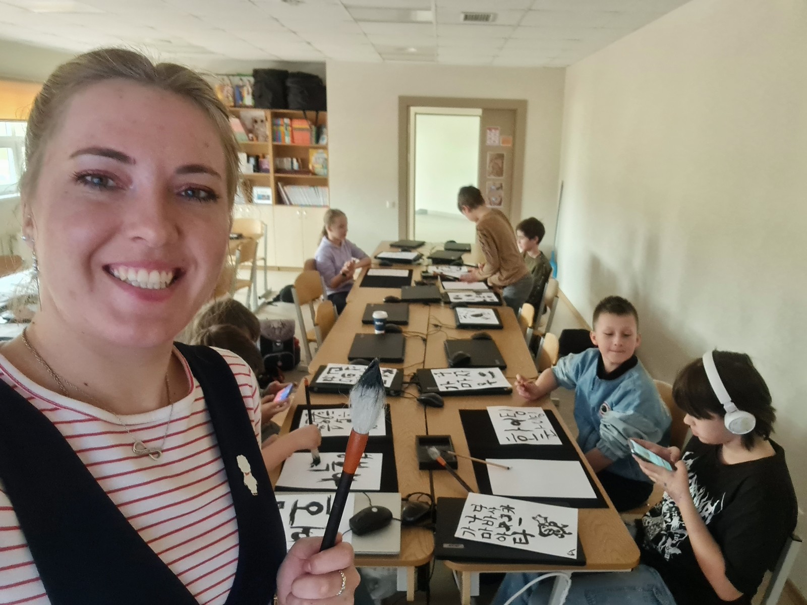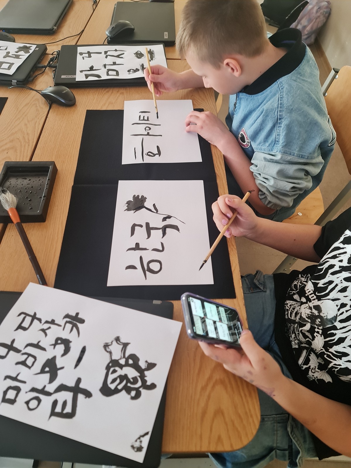 Korejiešu valodas un kultūras pulciņa dalībnieki 12. aprīļa pēcpusdienā izmēģināja savu roku sarežģītajā mākslas un daiļrakstīšanas veidā – 서예 (Sojē) jeb kaligrāfija. Pateicoties Korejas Republikas vēstniecības dāvinātajiem kaligrāfijas komplektiem, skolēni varēja izmēģināt gan rakstīt, gan zīmēt ar plūstošas melnās tintes palīdzību. Kaligrāfija ir viena no papildus prasmēm, kas Korejas darba tirgū aizvien tiek augsti novērtēta. Skaisti un glīti rakstīt nav viegli pat dzimtajā valodā, kur nu vēl uzrakstīt savu vārdu korejiešu valodā ar plūstošu tinti. Bērniem ļoti patika ne tikai uzzināt vairāk par kaligrāfiju, bet to arī pašiem pamēģināt – gan rakstot korejiešu alfabētā 한글 (hangeul), gan zīmējot orientālus zīmējumus pēc paraugiem.