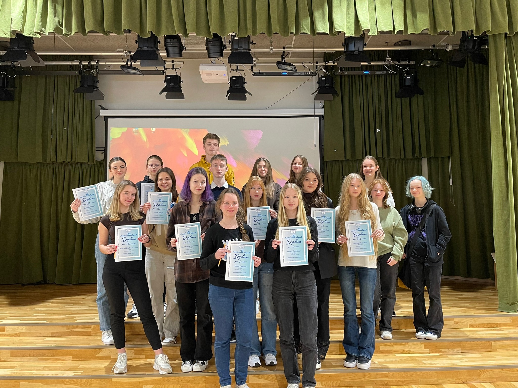 9.klašu grupā 1.vietu ieguva 9.d klases skolniece Liene Petkūna, 2.vietu ieguva 9.c klases skolniece Luīze Graudiņa un 9.a klases skolniece Taiga Marija Matvejeva, 3.vietu ieguva 9.a klases skolniece Lauma Kraukle un 9.b klases skolniece Marta Evelīna Tuča.