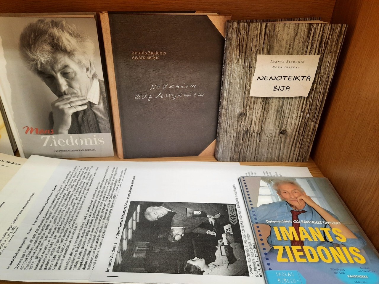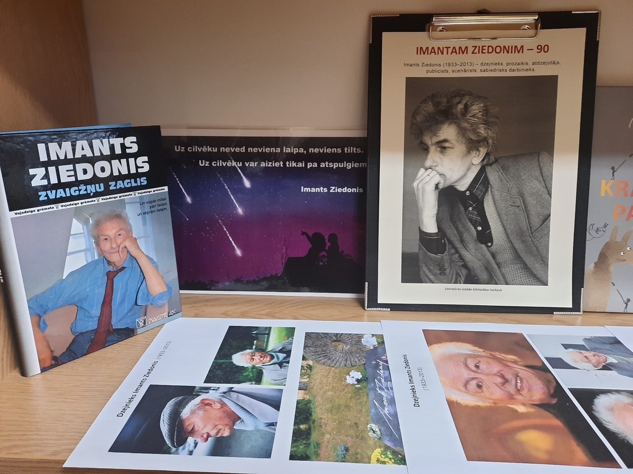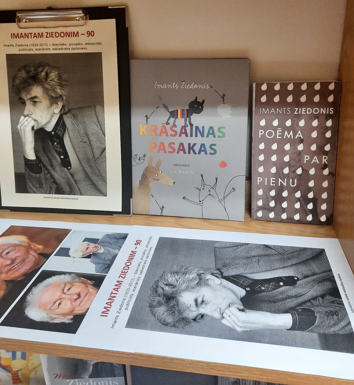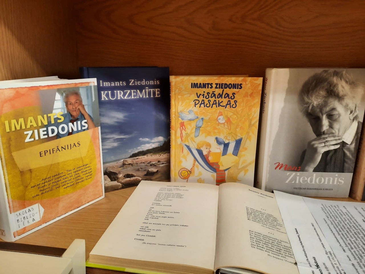 Šajā gadā tautā iecienītajam dzejniekam Imantam Ziedonim būtu svinēta 90 gadu jubileja. 4.-9. klašu bibliotēkas lasītavā interesentiem iespēja aplūkot Ziedonim veltītu literatūras izstādi. Tajā apkopotas ziņas par sabiedriski aktīvās un neparasti talantīgās personības dzīves gājumu un tās laikā radītajiem darbiem. Imants Ziedonis-dzejnieks, prozaiķis, atdzejotājs, publicists, scenārists, tulks, sabiedriskais darbinieks – viņa devums ir ļoti nozīmīgs latviešu tautas kultūrmantojumā.