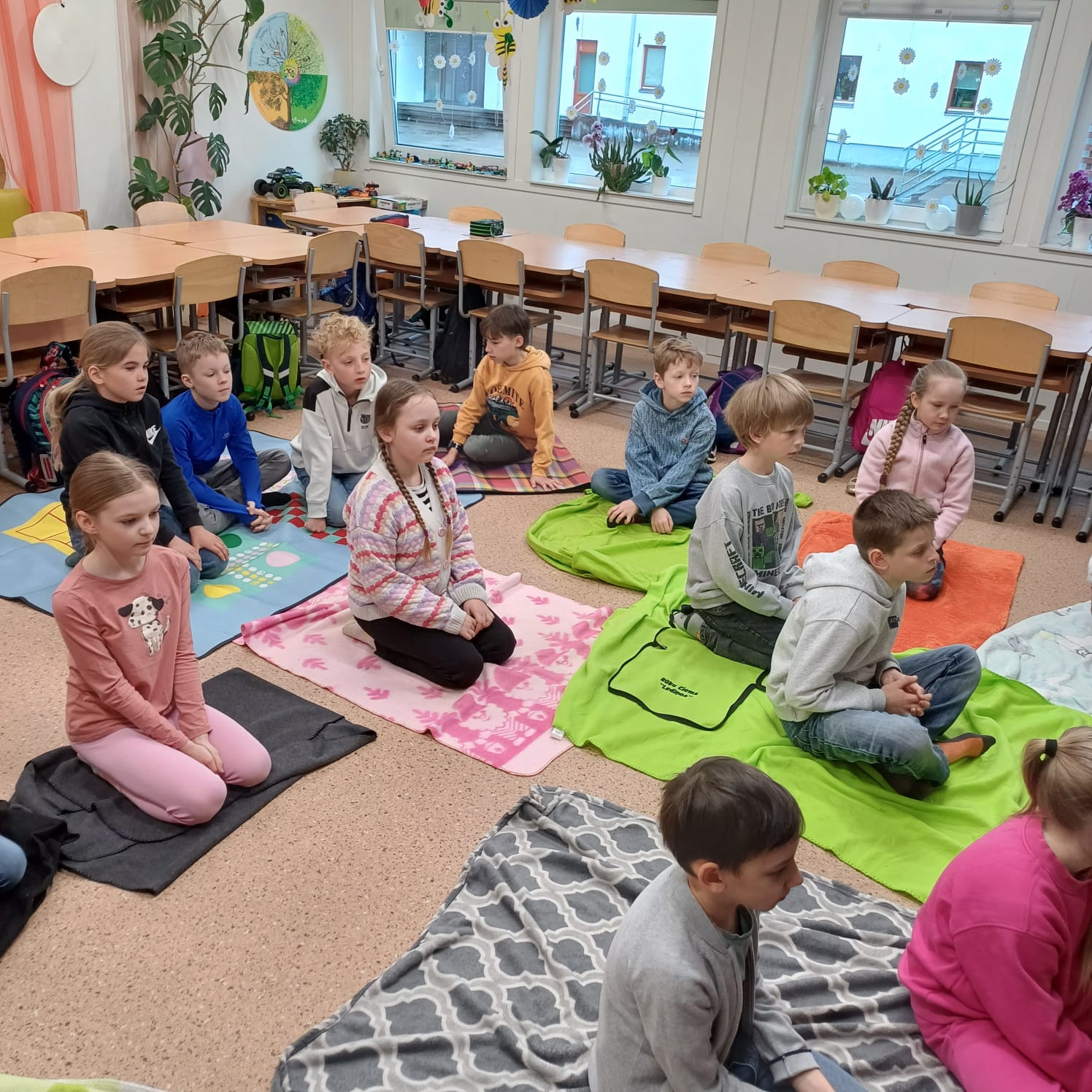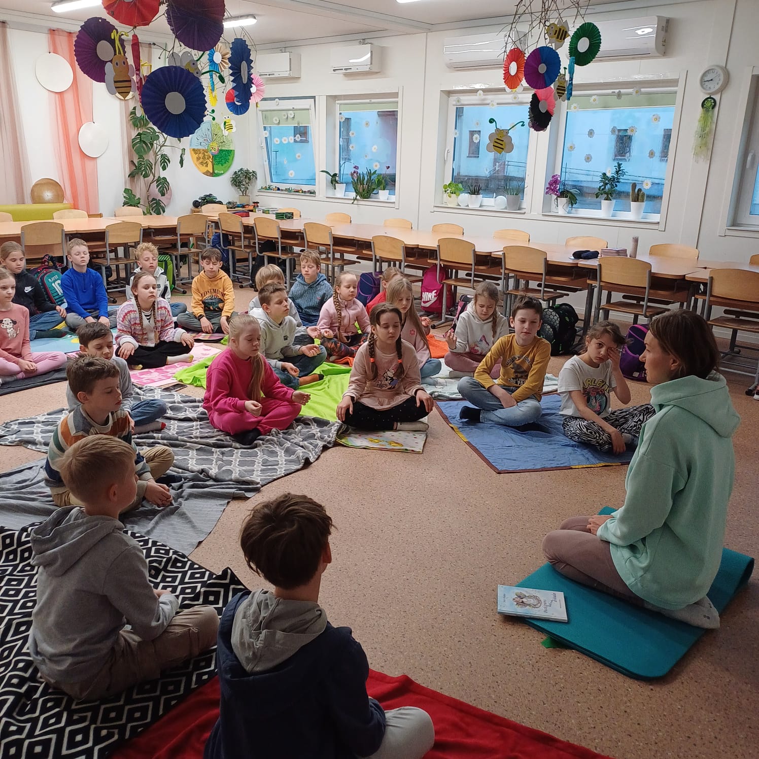 Pēc tam sekoja apzinātības pauze – brīdis, kad visi uz līdzpaņemtajām sedziņām apsēdās, lai iegrimtu klusumā, vērojot savas domas un sajūtas. Daudzi bērni atzina, ka šis bija ļoti patīkams un nomierinošs mirklis.