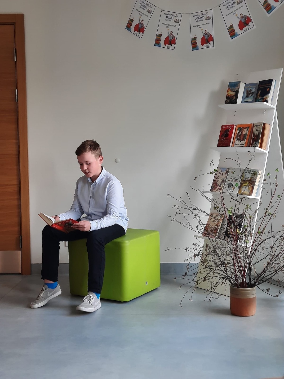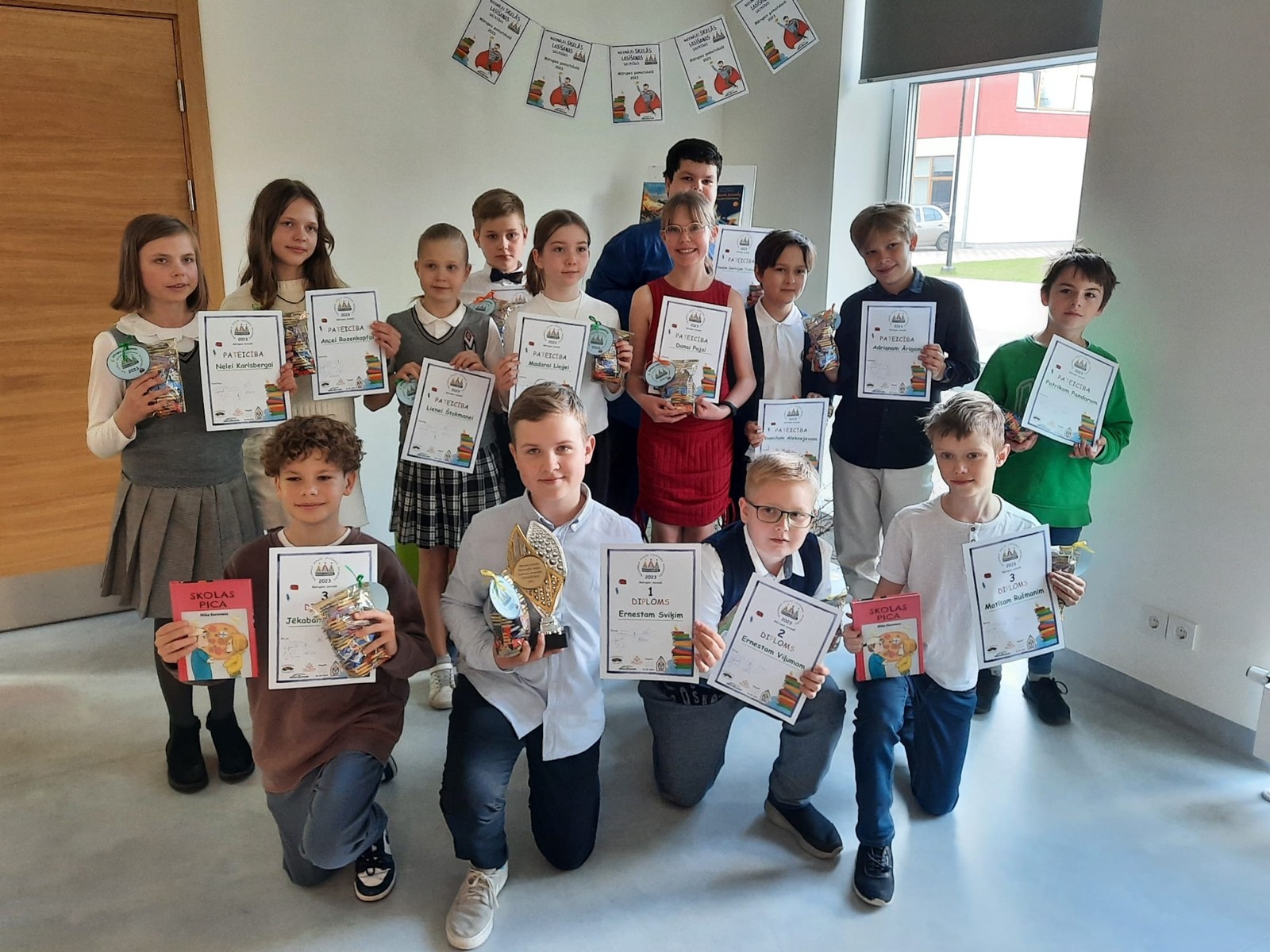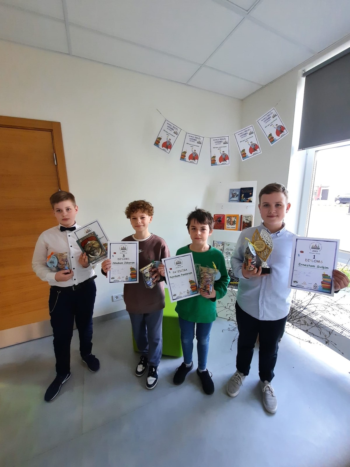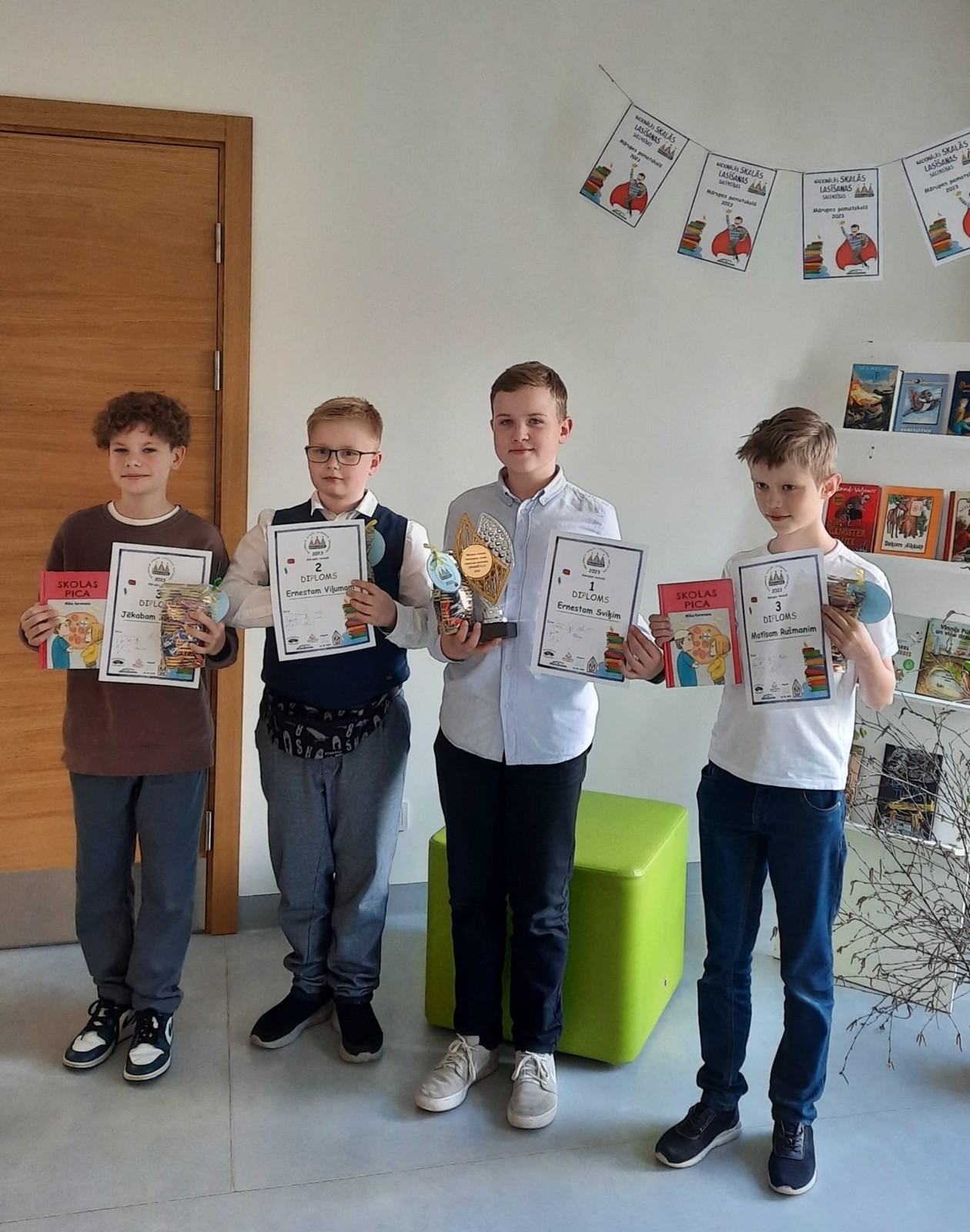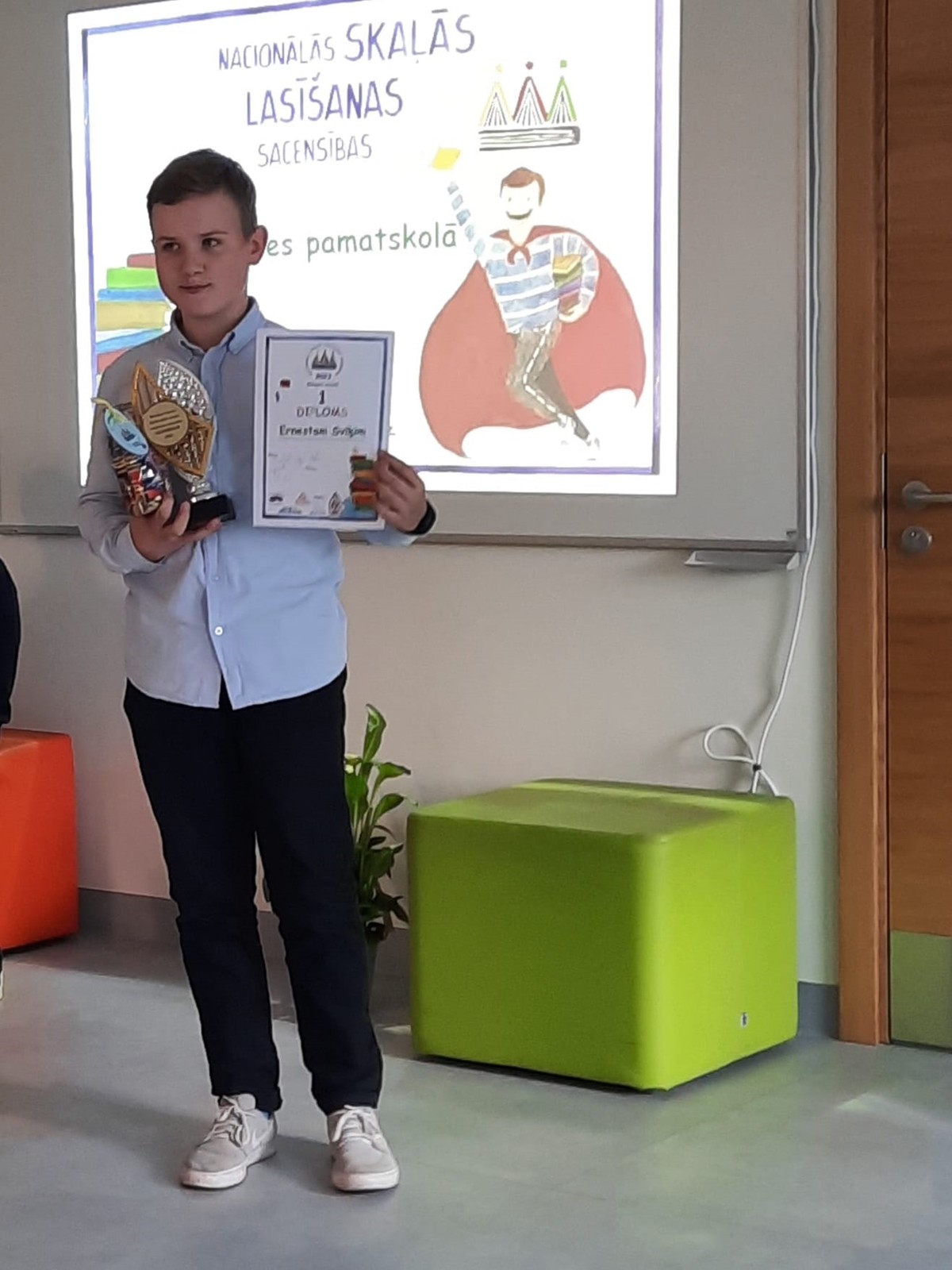 - vietu izcīnīja mūsu skolas 5. c klases skolnieks Ernests Sviķis! Apsveicam! Ernests lasīja fragmentu no D. Valjamsa grāmatas “Gangsteromīte”.