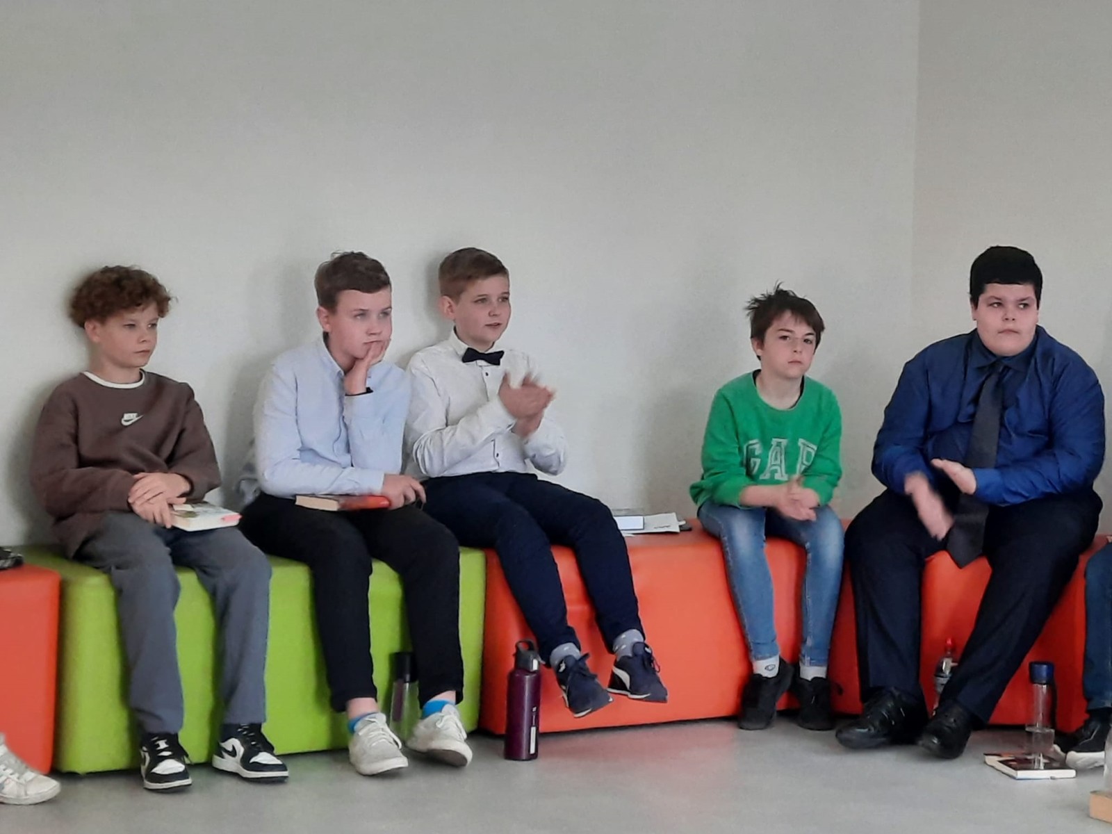 - vieta diviem dalībniekiem – mūsu skolas 5. b klases skolniekam Jēkabam Zāberam un Mārupes pamatskolas dalībniekam Matīsam Rušmanim. Abiem puišiem izrādījās vienāds žūrijas piešķirto punktu skaits. Jēkabs lasīja A. A. Milna grāmatas “Vinnijs Pūks un viņa draugi” fragmentu.