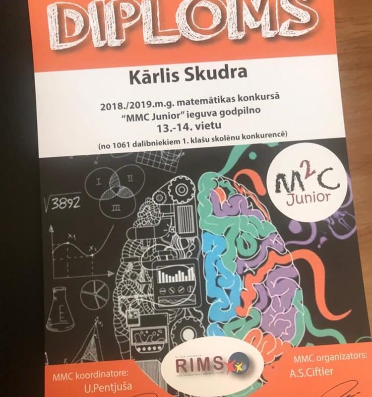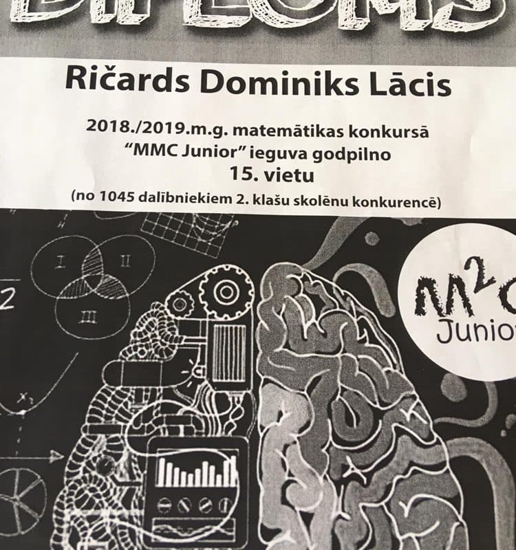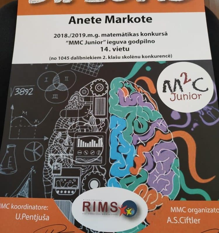 Mēs lepojamies ar mūsu skolēnu sasniegumiem matemātikas konkursā Latvijas mērogā Meridian Junior – 2019. 1.klašu grupā 1.b klases skolēns Kārlis Skudra no 1061 dalībniekiem  ieguva 13.-14.vietu. 2.klašu grupā  no 1045 dalībniekiem 2.b klases skolniece   Anete Markote ieguva 14.vietu, bet 2.c klases skolēns Ričards Dominiks Lācis 15.vietu. Paldies skolotājām Gundegai Adītājai, Daigai Ķesterei un Lailai Abuhovai un Mazo Einšteinu pulciņa skolotājai Anitai Līdakai par skolēnu sagatavošanu un virzīšanu uz sasniegumiem!