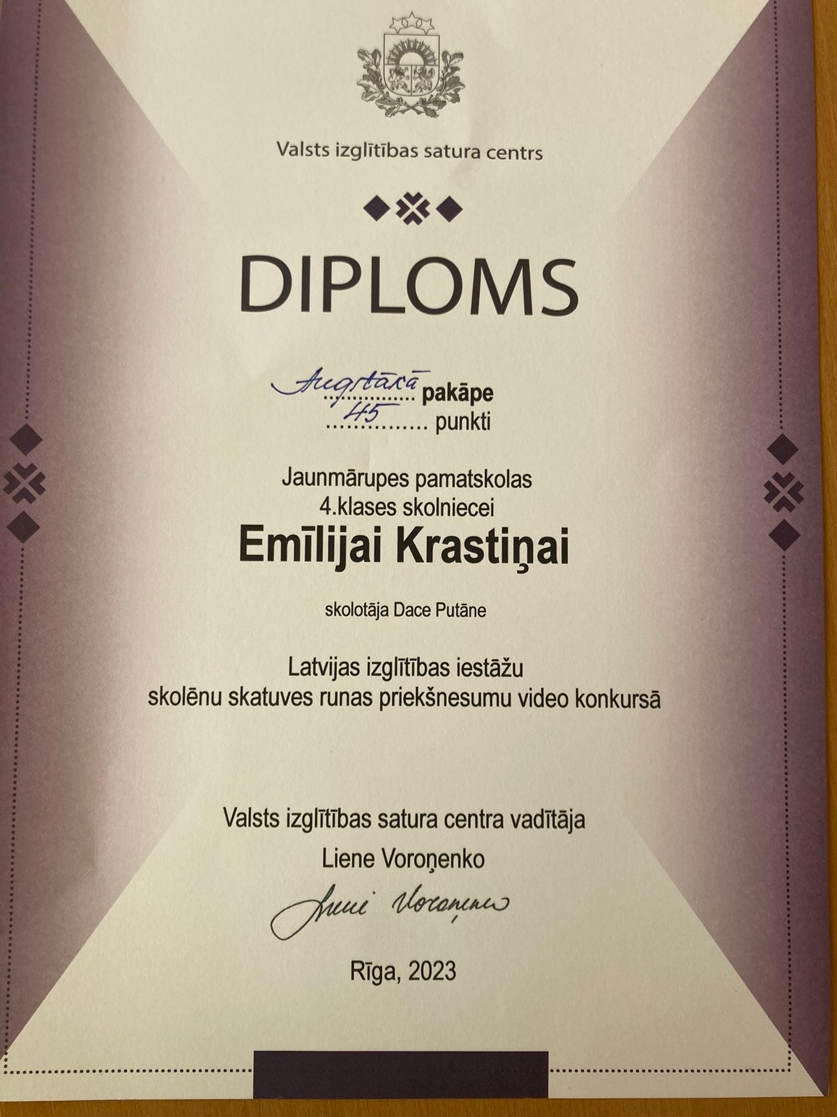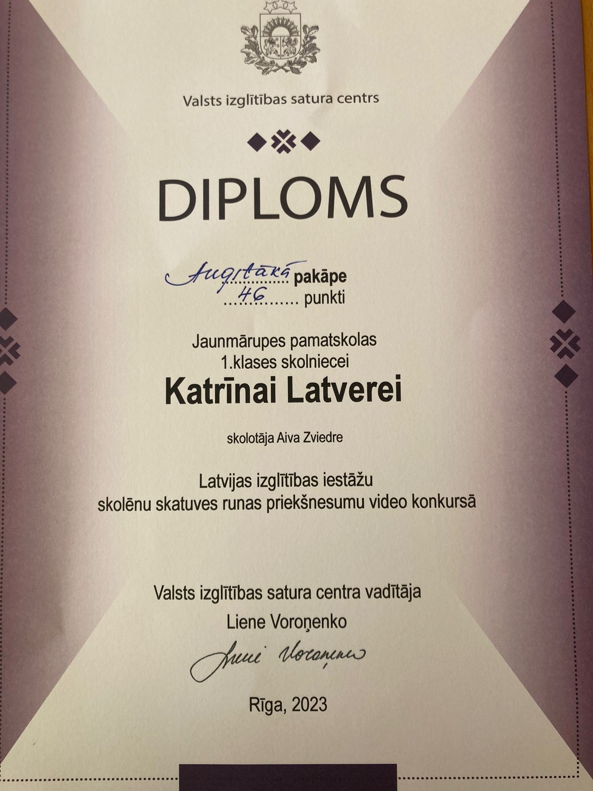 Mācību gada nogalē notika Valsts izglītības centra organizēts Skolu skatuves runas konkurss. Esam priecīgi, ka Katrīnai Latverei no 1.c klases un Emīlijai Krastiņai no 4.b klases ir iegūta augstākā pakāpe. Paldies skolotājai Aivai Zviedrei, Dacei Putānei, kas palīdzēja sagatavoties un skolotājai Jolantai Grosbergai Gernerei par videomateriāla filmēšanu, apstrādi un nosūtīšanu! Paldies vecākiem, kas atbalsta un virza savus bērnus uz sasniegumiem! Lai piedzīvojumiem bagāta vasara!