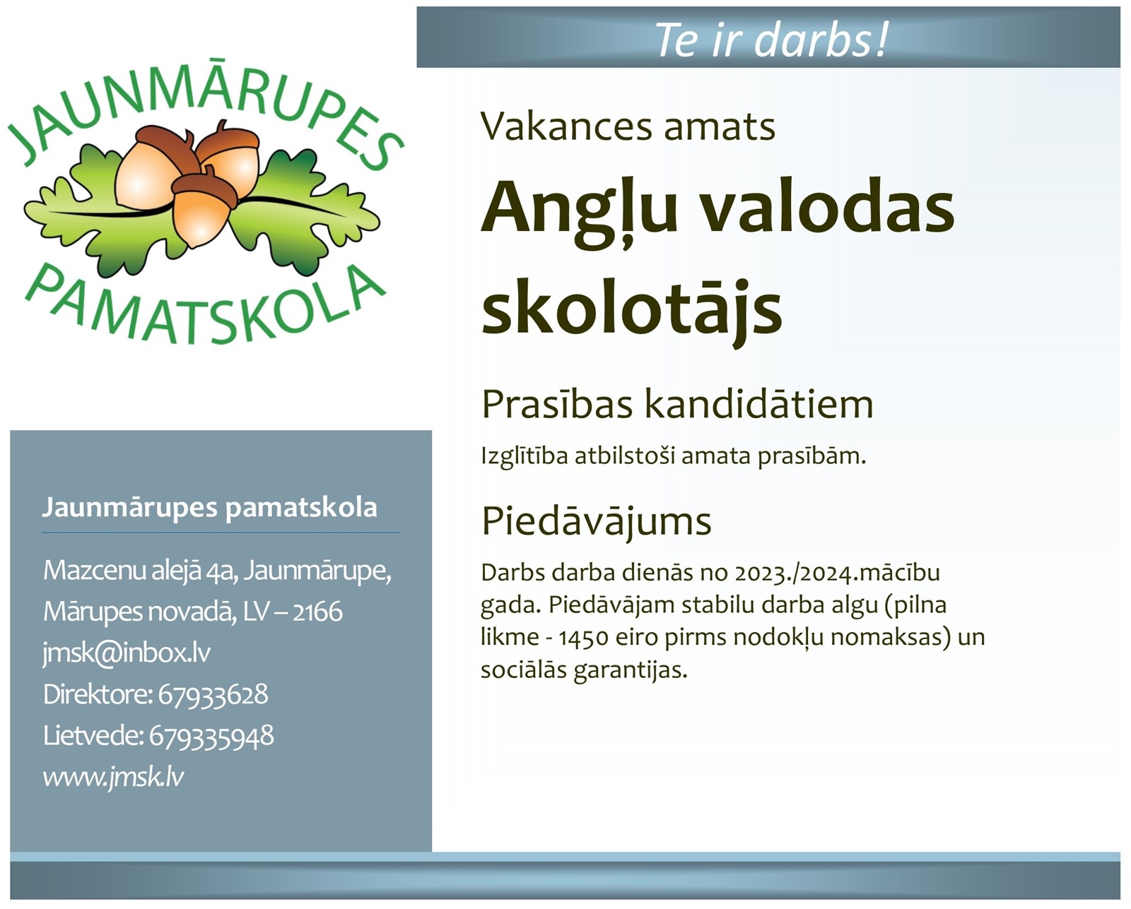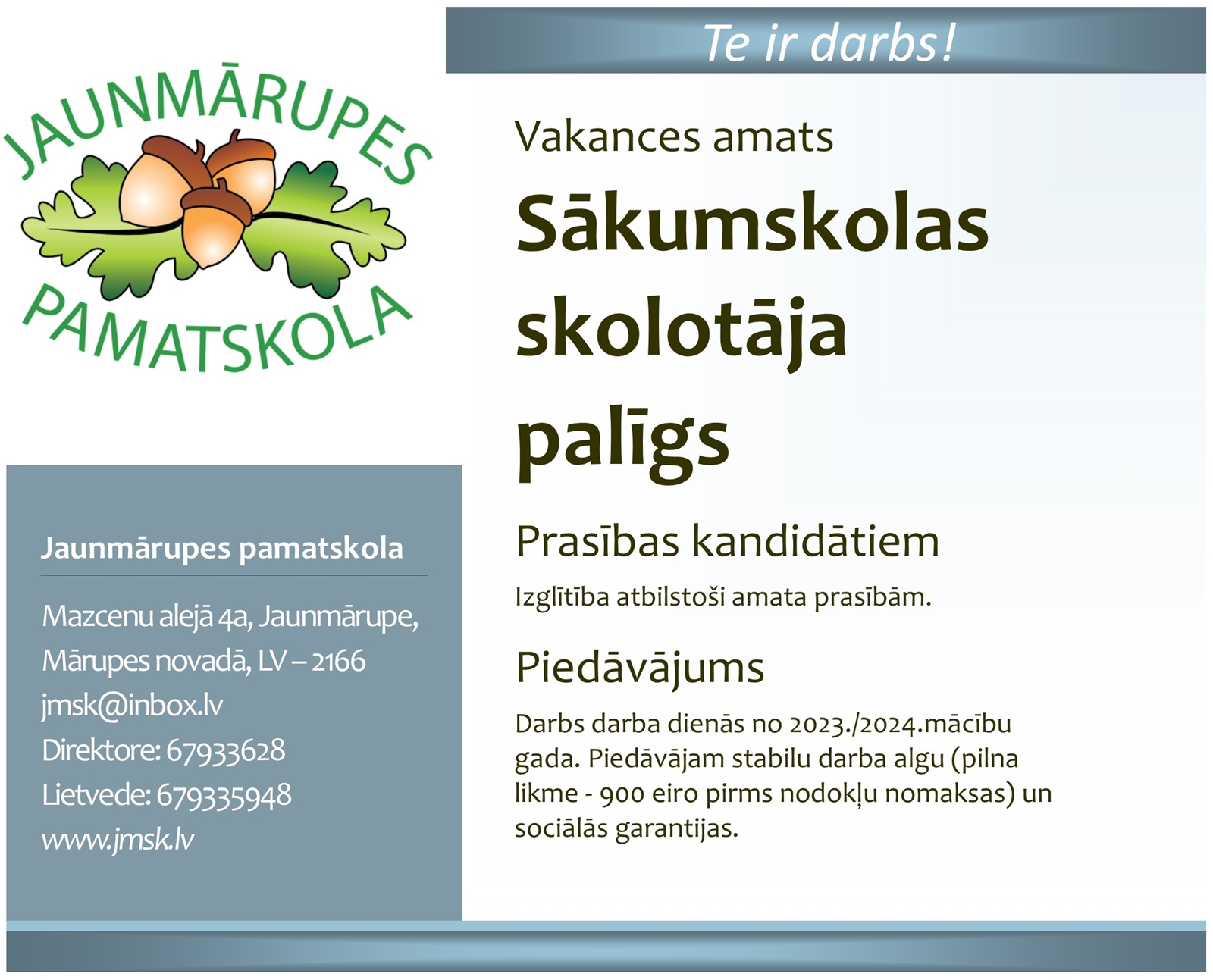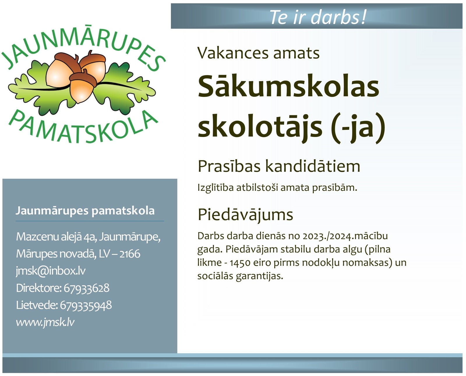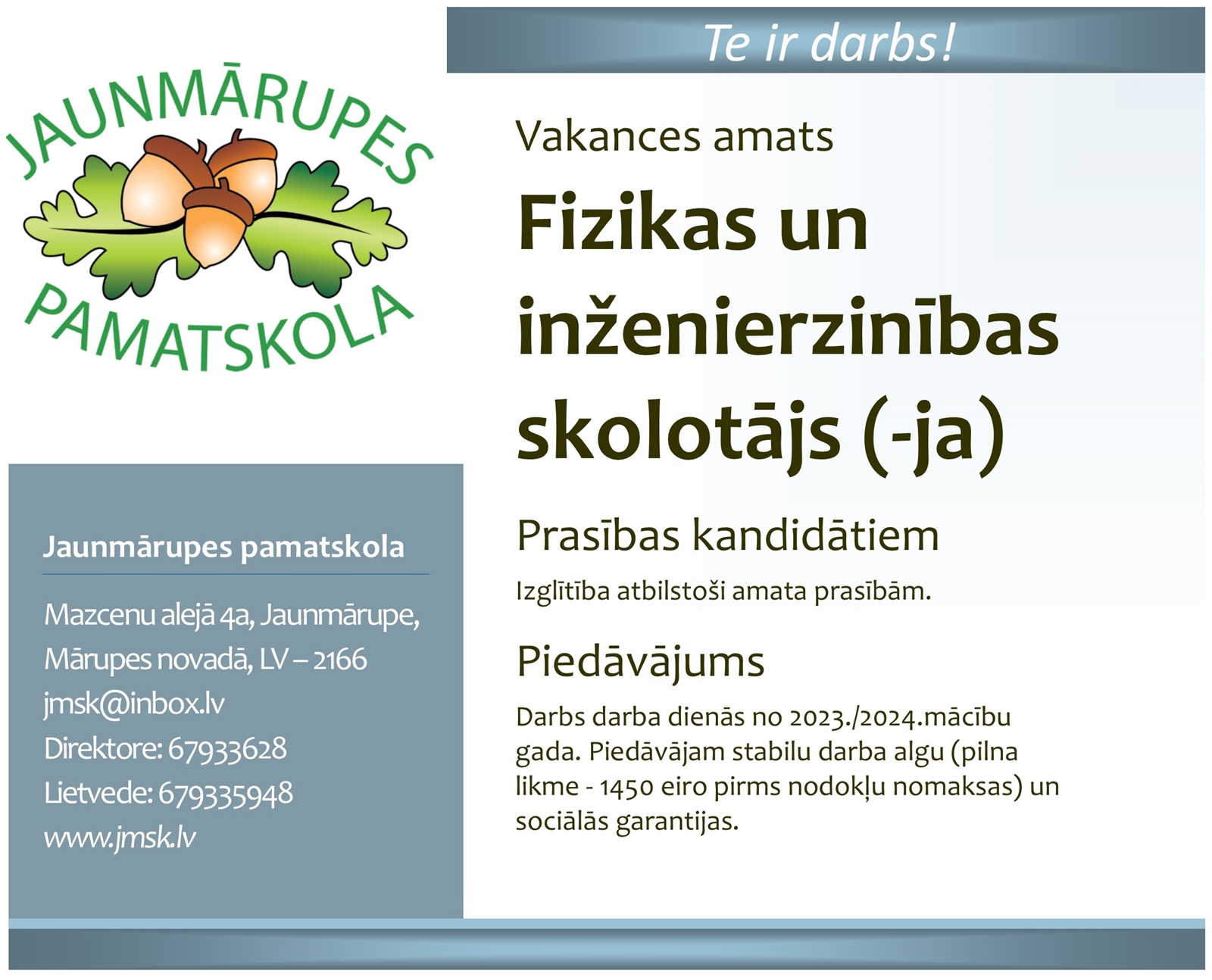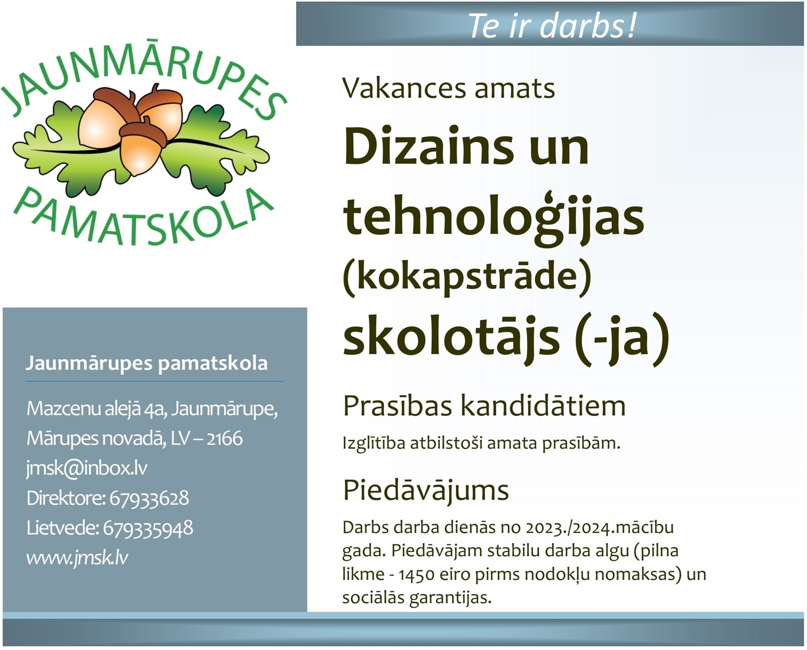 Ja vēlies strādāt radošā, atsaucīgā un draudzīgā kolektīvā, nāc un pievienojies! Sākot ar 2023./2024.mācību gadu aicinām darbā dizains un tehnoloģijas (kokapstrāde) skolotāju, fizikas un inženierzinību skolotāju, angļu valodas skolotāju, izglītības psihologu, sākumskolas skolotāju un sākumskolas skolotāja palīgus.