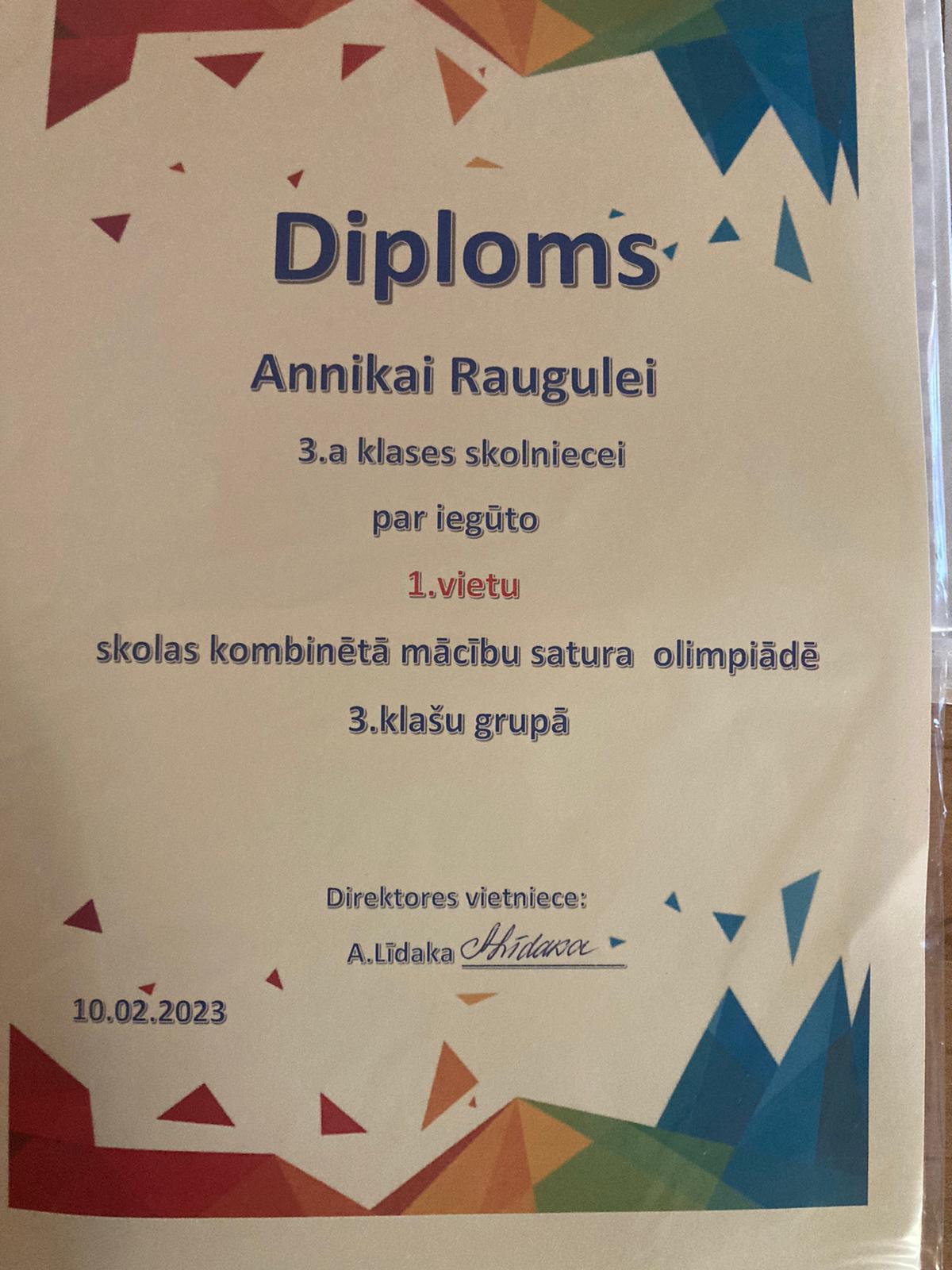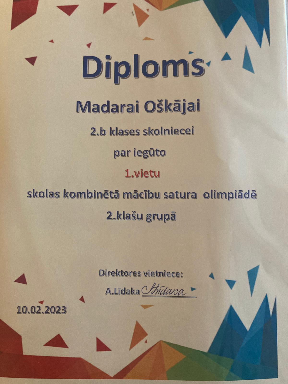 Otro klašu grupā kombinētā mācību satura olimpiādē 1.vietu ieguva Madara Oškāja no 2.b, skolotāja Gundega Adītāja, 2.vietu – Laura Kristiāna Ogsta no 2.e klases, skolotāja Baiba Laizāne un ar vienādu punktu skaitu 3.vietu dalīja Laima Vītoliņa no 2.a klases, skolotāja Sandra Velpa un Dace Opmane no 2.d klases, skolotāja Laila Kalniņa. Atzinību saņēma Marta Oškāja no 2.d klases.