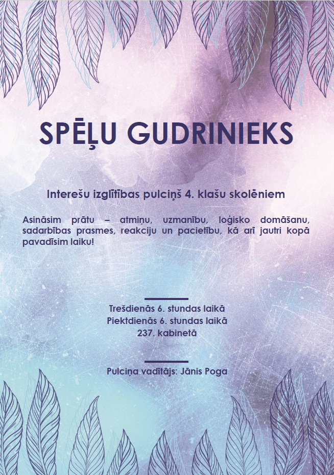 Interešu izglītības pulciņu grafiks 2025./2026. mācību gadā Interešu izglītības pulciņu plakāti 2025./2026.m.g. Grāmatnieki 3.klasēm (sk. Eva Feldmane) Korejiešu valodas un kultūras pulciņš 4. -9.klasēm (sk. Linda Seldava) Koris 4. – 9.klasēm (sk. Baiba Rudzīte) Matemātikas pulciņš 7. -9.klasēm (sk. Aija Gavare) Mazais inženieris (STEAM pulciņš) 2. – 3.klasēm (sk. Ilze Brante) Mazie Einšteini 2. – 3.klasēm (sk. Anita Līdaka) Vairāk informācijas Robottehnika – FLL komanda (STEAM pulciņš) 7. – 9.klasēm (sk. Dainis Koreņuks) Zaļais eksperiments (STEAM pulciņi) 7. – 9.klasēm (sk. Sniedze Kalniņa, Dainis Koreņuks, Inga Melngaile un Sarmīte Norenberga) Spēļu gudrinieks 4.klasēm (sk. Jānis Poga) Jaunie vēsturnieki 4. – 8.klasēm (sk. Karīna Štelfa) Rokdarbu pulciņš 4. – 6.klasēm (sk. Līva Prekele) Apzinātības pulciņš 4.c .klasei (sk. Līva Prekele) Spēļu gudrinieks 5.klasēm (sk. Gatis Upesleja) Interešu izglītības reklāmas drīzumā tiks papildinātas