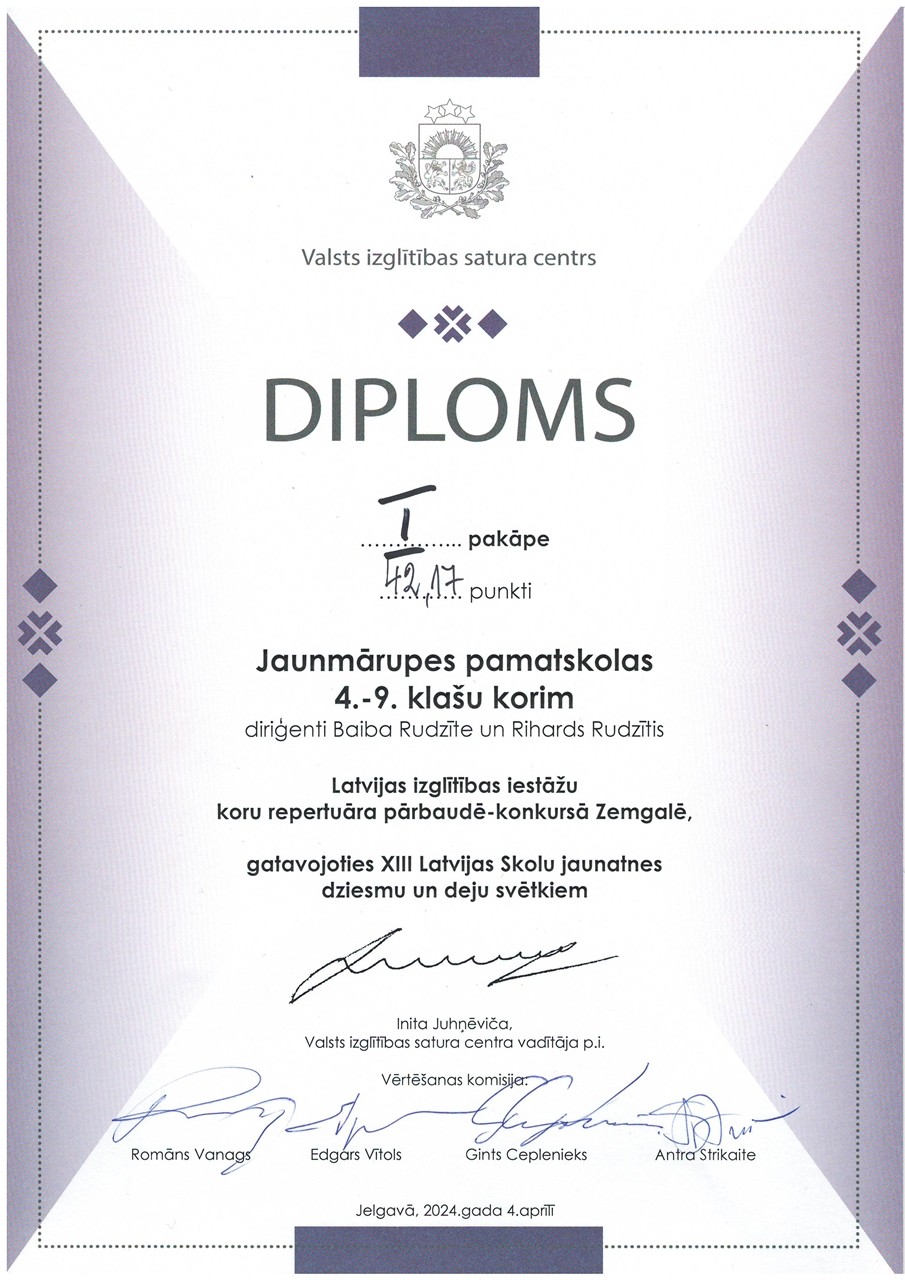 Jaunmārupes pamatskolas 4.-9. klašu koris pēc dalības koru skatē, ieguva iespēju piedalīties arī 2.kārtā- Latvijas izglītības iestāžu koru repertuāra pārbaudē- konkursā Zemgalē, gatavojoties XIII Latvijas Skolu jaunatnes dziesmu un deju svētkiem, ko īsteno Valsts izglītības satura centrs. Koris priecēja žūrijas komisiju ar savu patiesi sirsnīgo sniegumu un neizsakāmu degsmi koristu sejās, kas liecina par katra kora dalībnieka mīlestību pret dziedāšanu. Žūrija novērtēja kora muzikālo un izjusto izpildījumu un piešķīra godpilno I pakāpi.