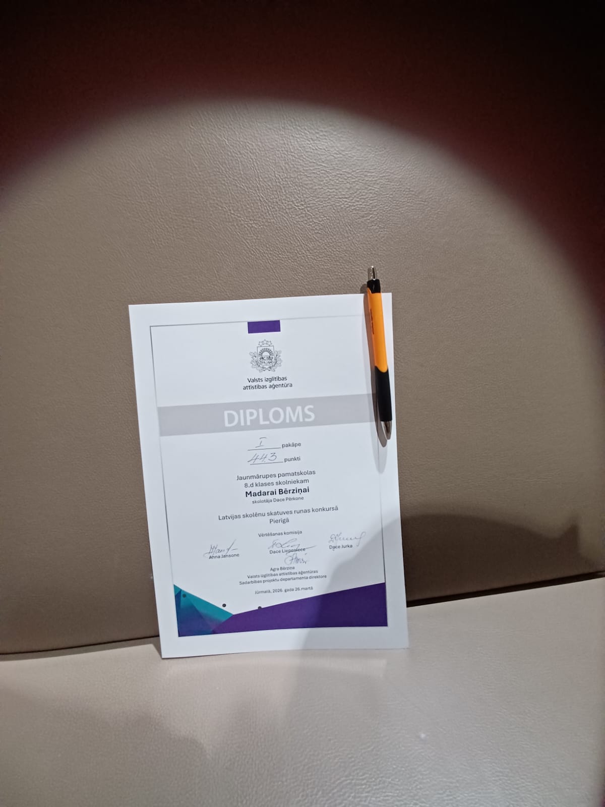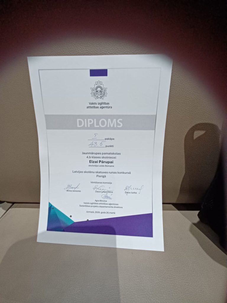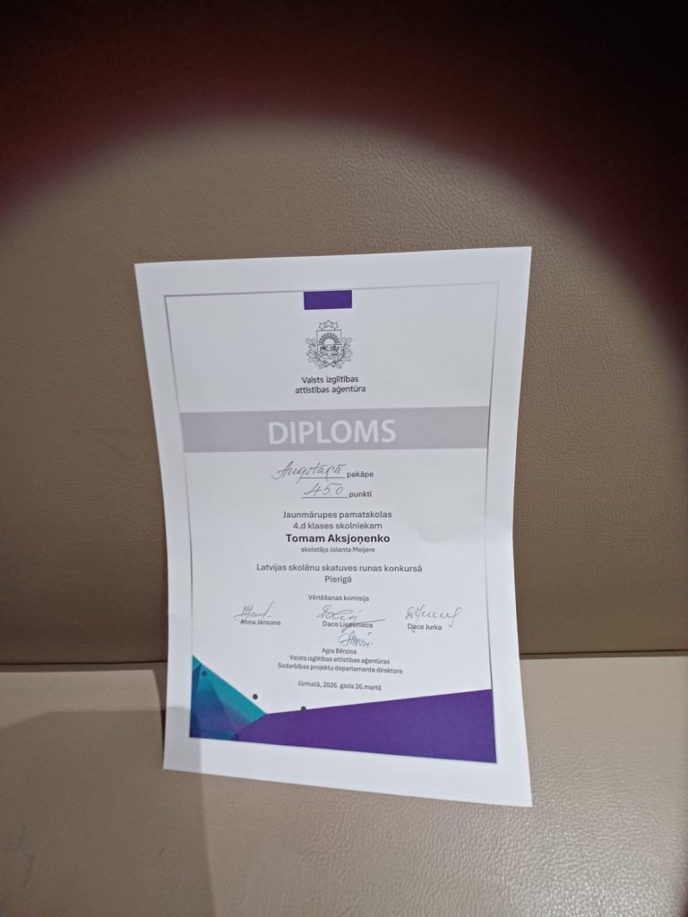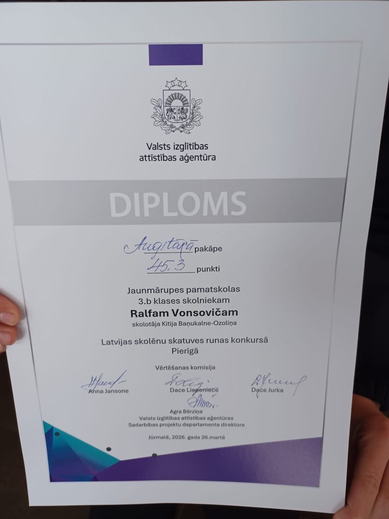 26. martā Jūrmalas Mūzikas vidusskolā notika Pierīgas reģiona skatuves runas konkurss, kurā piedalījās arī mūsu skolas labākie daiļrunātāji. 1.-3 klašu grupā no 17 dalībniekiem 3. b klases skolnieks Ralfs Vansovičs (sk. K. Baņukalne Ozoliņa) ieguva Augstākās pakāpes diplomu.