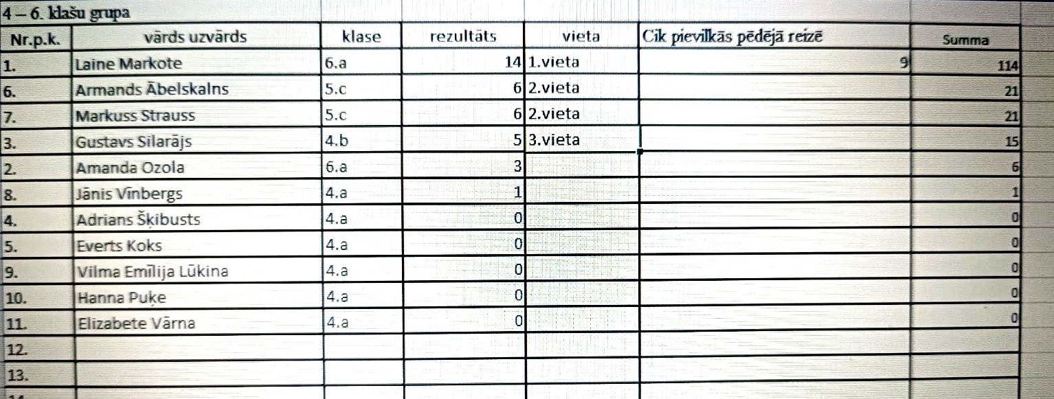 - 1. vietu izcīnīja Laine Markote (summā pievelkoties 114 reizes)