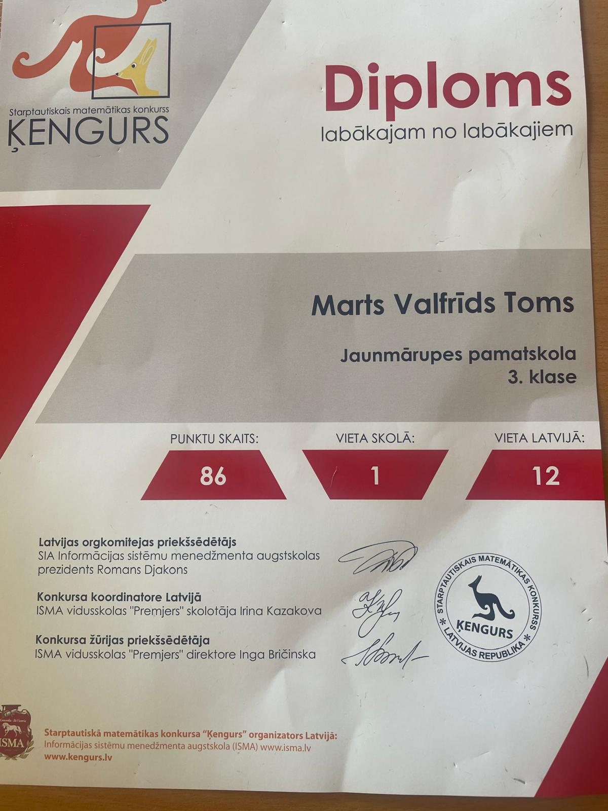 3.klašu grupā Latvijas mērogā piedalījās 2347 dalībnieki. Toms Marts Valfrīds no 3.c klases ieguva 12.vietu Latvijā, izpildot 99% no visiem uzdevumiem. Krišāns Edgars 3.a-97%, Utināns Valters 3.e-98%, Rinkevica Līva 3.c-97%, Silagaile Aleksa 3.d-96%, Gergelevičs Valters 3.e-95%, Grīnvalds Valters 3.c-94%, Kutka Gustavs 3.a-94%, Millers Gustavs 3.b-94%, Laima Poikāne 3.d 91%.