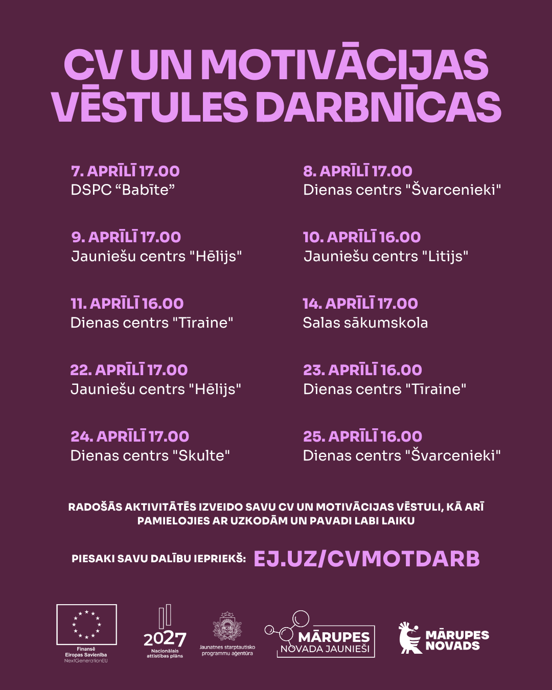 Vai vēlies uzlabot savu CV un motivācijas vēstuli, lai iekarotu darba tirgu vai pieteiktos vasaras darbam Mārupes novadā? Pievienojies praktiskajām darbnīcām, lai uzzinātu, kā izcelt savas prasmes un pieredzi, radot profesionālu un pamanāmu dokumentu.