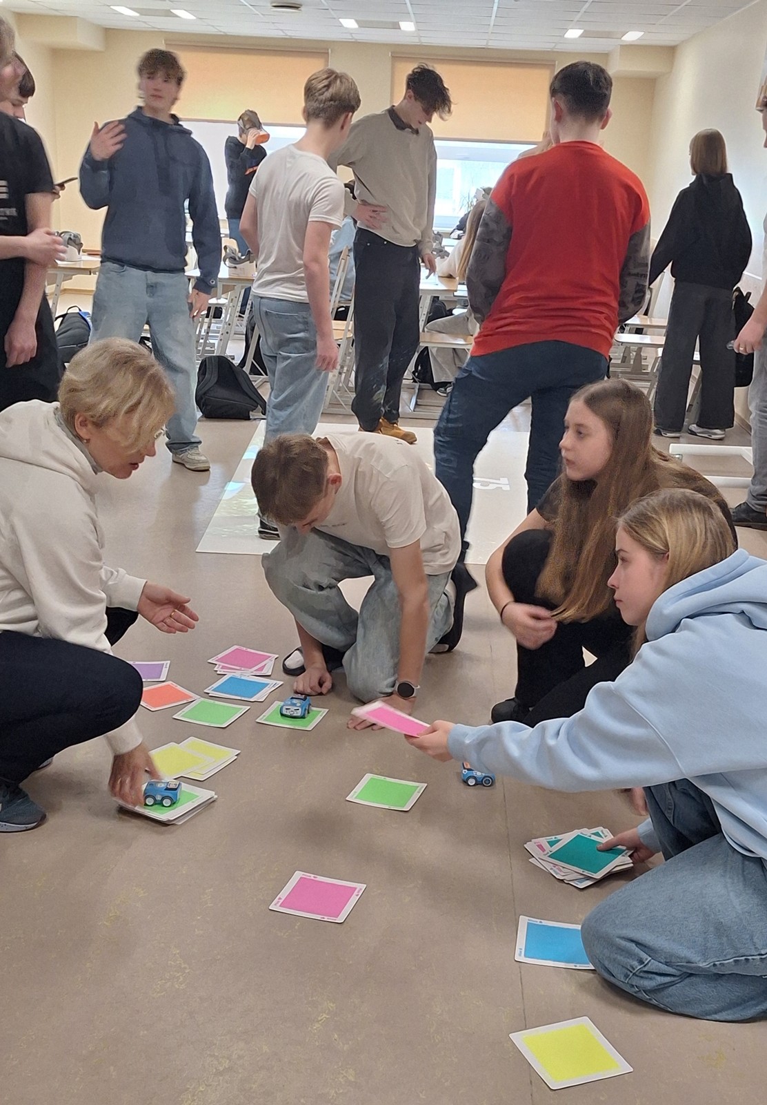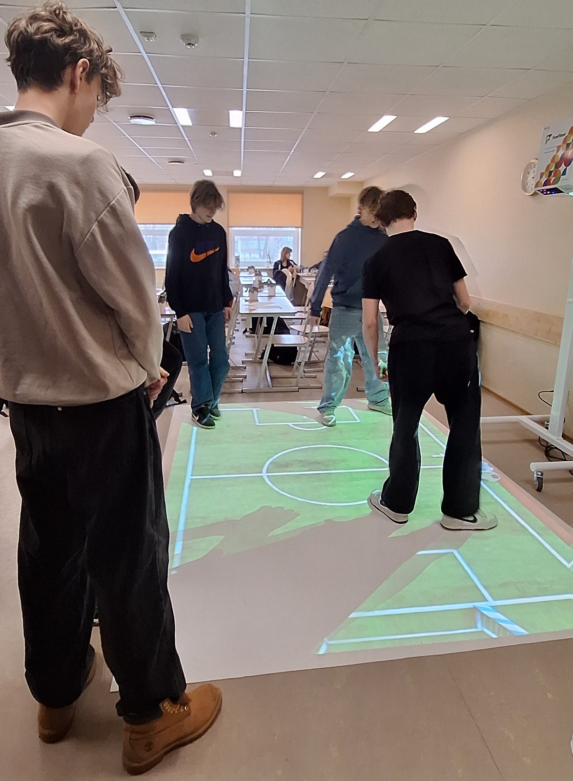 Nodarbības ietvaros jaunieši izkustējās uz interaktīvās grīdas spēlējot futbolu. Ar Sphero Indi robotu, kuram ir iebūvētais krāsu sensors un krāsu kartēm, programmēja robota kustību ceļu.