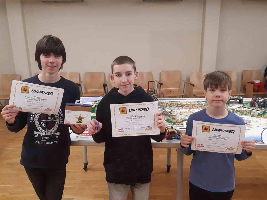 Mūsu jaunieši pašu spēkiem uzbūvēja savu pirmo robotu misiju izpildei un neatlaidīgi pilnveidoja tā vadības programmu visas sacensību dienas garumā. Par ieguldīto darbu un lielisko sadarbību komanda izcīnīja 3. vietu robotu spēles kategorijā.