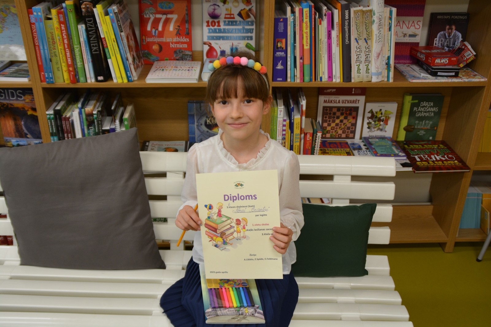 - vieta dalībniecei no 3. b klases – Norai Brantai. Nora izjusti nolasīja fragmentu no A. Taraskas grāmatas “Punktiņa un Kleksis”, kā arī bija jauki parūpējusies par tekstam atbilstošu vizuālo tēlu