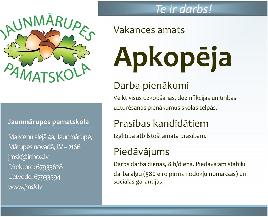 Jaunmārupes pamatskola aicina darbā 3 apkopējas
